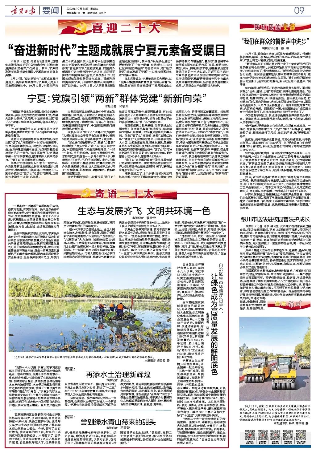 生态环境保护顶层设计不断强化。宁夏先后出台了《关于全面加强生态环境保护坚决打好污染防治攻坚战的实施意见》《自治区党委关于建设黄河流域生态保护和高质量发展先行区的实施意见》等重要文件,作出守好改善生态环境生命线、走出一条高质量发展新路子的重大战略部署,明确建设河段地方安全标准区、生态保护修复示范区、环境污染防治率先区、经济转型发展创新区、黄河文化传承彰显区的战略定位。在6.64万平方公里的土地上,全区人民治山治水、种草栽树、绿色发展,描绘了美丽新宁夏的秀美画卷。“四尘”同治、“五水”共治、“六废”联治大力推进,城市建成区20蒸吨/小时以下燃煤锅炉实现清零,33座城镇污水处理厂全部达到一级A排放标准,自治区级以上工业园区废水全部实现集中处理,细颗粒物(PM2.5)、可吸入颗粒物(PM10)平均浓度均达到历史最低值,空气质量优良天数比例连续6年保持在80%以上,地表水Ⅲ类以上断面比例稳定在80%以上。宁夏全力确保黄河安澜,黄河干流宁夏段水质总体为优,连续五年实现Ⅱ类进Ⅱ类出。“三山”生态保护修复有力推进,贺兰山生态环境综合整治取得明显成效。绿色低碳发展加快推进,全区清洁能源发电装机达到2839万千瓦,新能源发电量达到464.5亿千瓦时。单位GDP二氧化碳排放扭转了“十三五”以来不降反升局面。生态文明建设目标评价考核和责任追究制度、生态补偿制度、河湖长制、环境保护“党政同责”和“一岗双责”等制度为“绿水青山”保驾护航。用水权、土地权、排污权、山林权、用能权、碳排放权改革,激活美丽新宁夏建设“一池春水”。“过去的十年,我们一起见证了污染防治攻坚战以及生态文明建设的历史进程。党的二十大即将召开,我们将持续协同推进降碳、减污、扩绿、增长,以生态环境高水平保护推动经济高质量发展、创造高品质生活,建设人与自然和谐共生的现代化。”自治区生态环境厅负责人说。党的十八大以来,宁夏认真学习贯彻落实习近平生态文明思想,坚持绿水青山就是金山银山的理念,坚持山水田林湖草沙一体化综合治理,先后实施了小流域综合治理、坡耕地综合整治、淤地坝建设与治理等水土流失治理项目,水土保持治理取得突破性进展和历史性成就,增添了宁夏优美生态环境的“底色”和“亮色”。宁夏在全国率先将水土保持领域乱象治理纳入扫黑除恶专项斗争范围,实现包括房地产开发项目在内的生产建设项目监管全覆盖。特别是近三年来,审批水土保持方案2453件,超过了“十二五”和“十三五”十年审批数量的总和,生产建设项目人为水土流失得到有效控制。金秋迎盛会。宁夏水利厅水土保持处郭文峰告诉记者,党的二十大胜利召开,会引领水土保持工作进入一个新征程。宁夏也将继续坚持贯彻落实习近平生态文明思想,结合巩固拓展脱贫攻坚成果同乡村振兴有效衔接,在水土流失治理面上取得重大成就的同时,在治理的点上、线上再添新异彩新辉煌,涌现出更多“金鸡坪”“龙王坝”等生态美景和治理典型,把宁夏乡村最美的生态治理成果呈现在世人面前,让宁夏的老百姓生活得更安逸、更舒适、更幸福。自治区生态环境厅负责人:让绿色成为高质量发展的鲜明底色党的十八大以来,习近平总书记在多个场合一以贯之强调坚持走生态优先、绿色低碳发展道路。十年间,宁夏坚决贯彻新发展理念,真抓实干,推动经济社会发展全面绿色转型。全面推进国家新能源综合示范区建设,将碳达峰、碳中和纳入全区生态文明建设整体布局和经济社会发展全局,大力推动产业结构、能源结构、交通运输结构、用地结构调整,全区清洁能源发电装机达到2839万千瓦,新能源发电量达到464.5亿千瓦时,累计退出煤炭产能569万吨,整治“散乱污”工业企业1495家,淘汰落后产能1448万吨。宁夏建立生态环境分区管控体系,在全国第一批公开省级“三线一单”成果,即生态保护红线、环境质量底线、资源利用上线和生态环境准入清单),并实现地级城市全覆盖。制定碳达峰实施方案,开展碳减排管理试点,积极参与全国碳排放权交易,顺利完成全国首个碳排放履约周期工作。压减 “两高”项目39个,减少能耗1725万吨标准煤。上收化学原料药、农药、染料行业环评审批权限,项目环境准入把关更加严格、源头管控更加有力有效。单位GDP二氧化碳排放扭转了“十三五”以来不降反升局面。自治区生态环境厅负责人表示,未来五年,希望我区继续加大“机制改革、科技创新、多管齐下、多轮驱动,”推动绿色低碳大发展,统筹抓好节能降碳增效、绿色低碳循环、绿色生活创建,加快形成节约资源和保护环境的经济发展方式。固原市原州区彭堡镇硝沟村生态护林员杨军今年74岁,从2000年开始,他当过退耕还林护林员、天保工程护林员,这几年又享受上了生态护林员的好政策,算起来护林有20年了。“都说绿水青山就是金山银山,一直护林子,这两年我也尝到了经济林的甜头。今年,我种了23亩红梅杏,就在家里的院子前,村里的干部说这叫发展庭院经济。人把苦下了,杏子也长得好,预计今年能卖上2万元。”杨军告诉记者,虽然年纪大了,但精神好,每天还能骑着电动车巡林护林。这么多年,特别是这十年,感受到了党的好政策,对农民、对农村很关心,眼看着村里的环境越来越好,村民的日子也越过越好