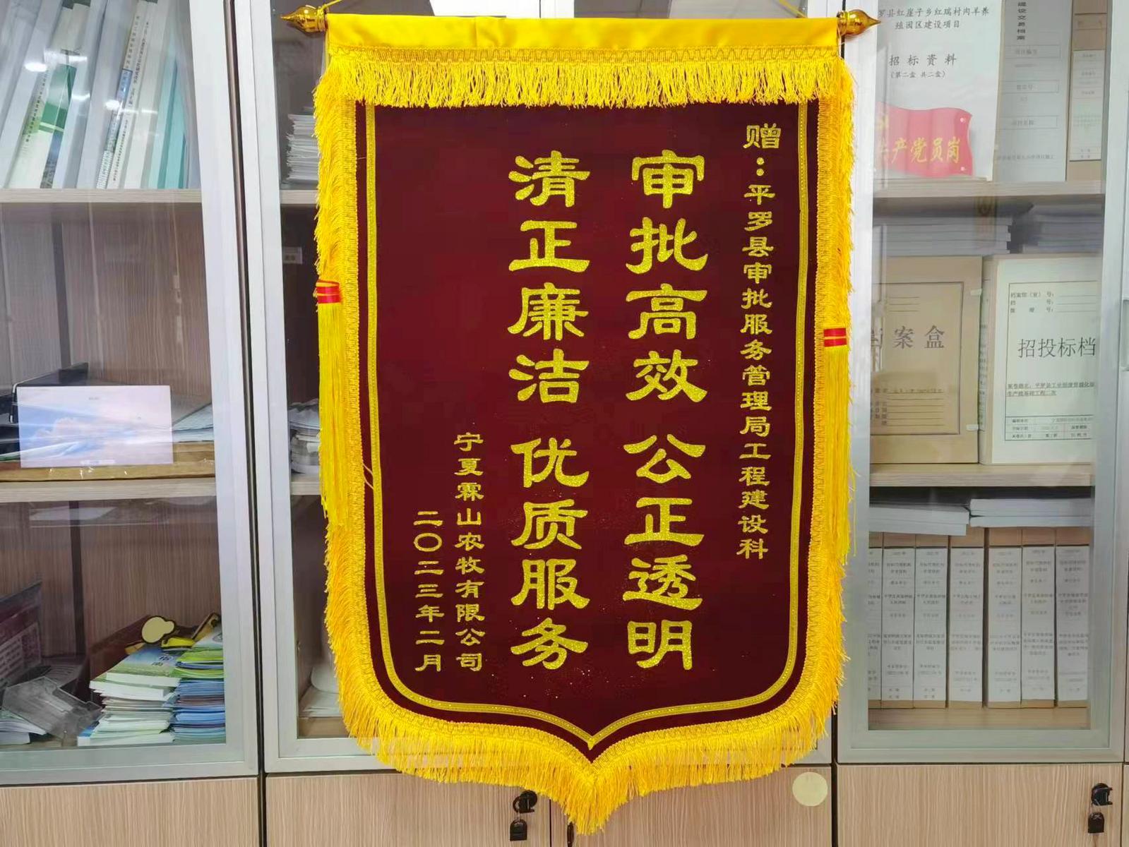 “自我们项目审批提档升级后,效果非常好!这不,这是最近收到的企业感谢锦旗。”3月22日,走进石嘴山市平罗县政务服务大厅,该县审批服务管理局副局长陈文杰向记者分享最新收到的一面锦旗,这是宁夏霖山农牧有限公司送来的,上写有“审批高效、公正透明、清正廉洁、优质服务”16个金灿灿的大字。