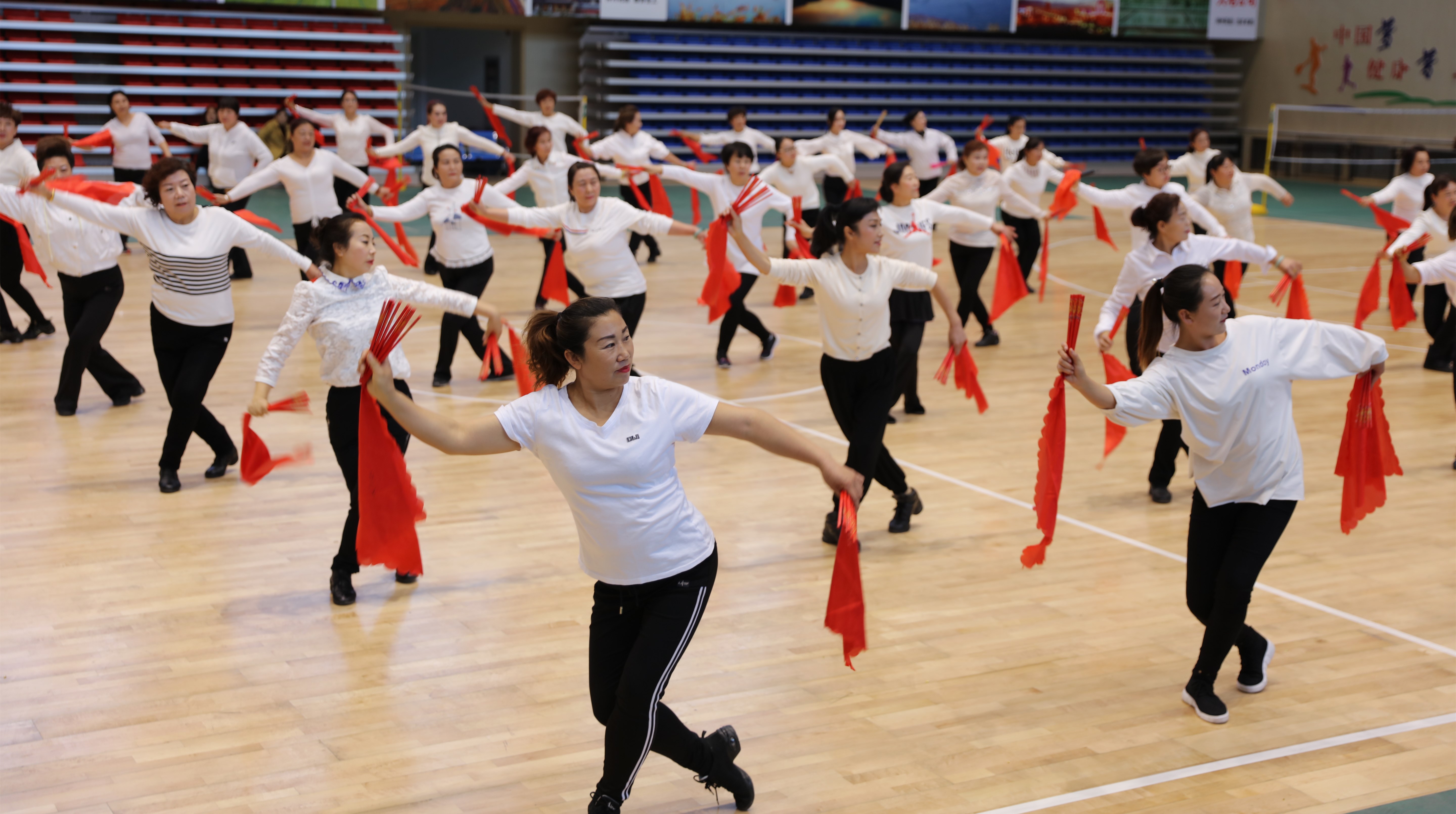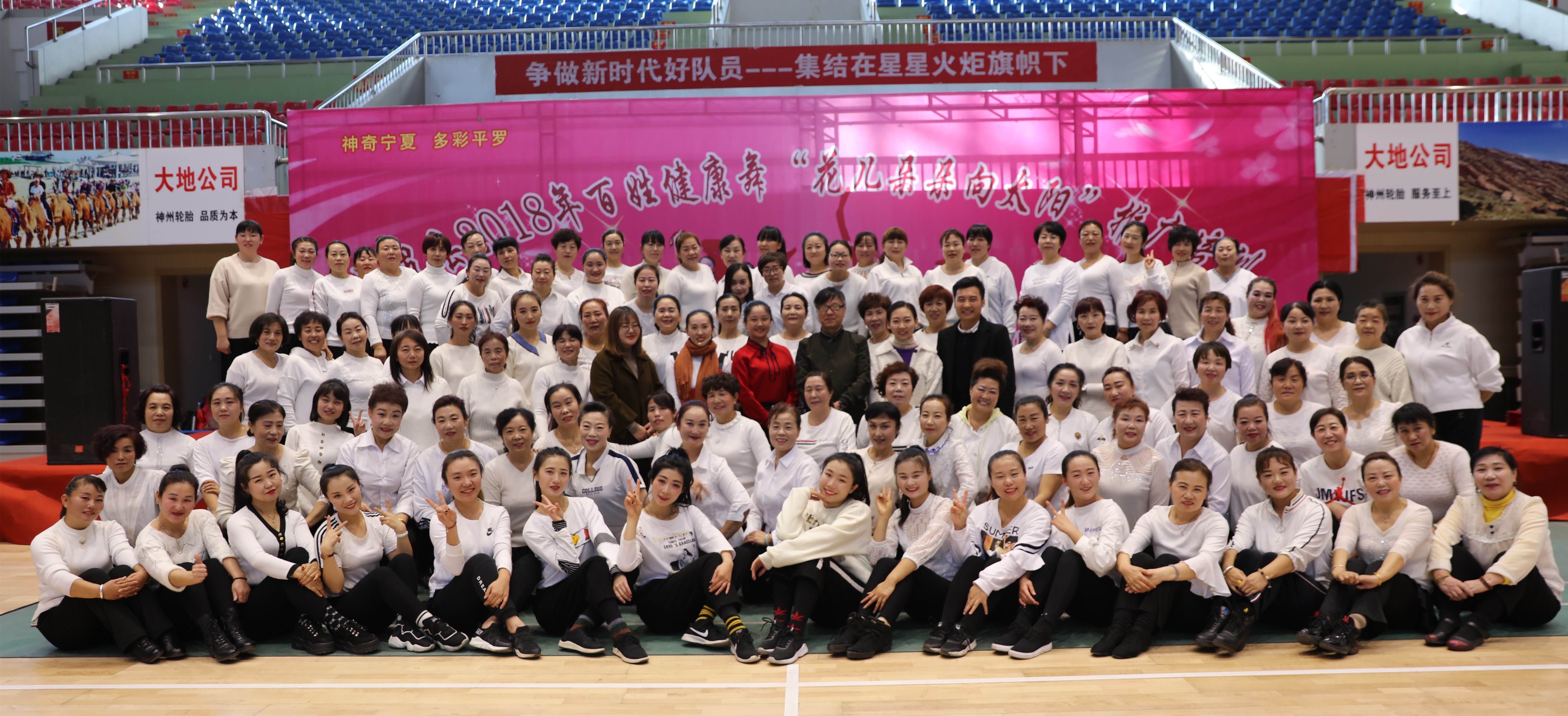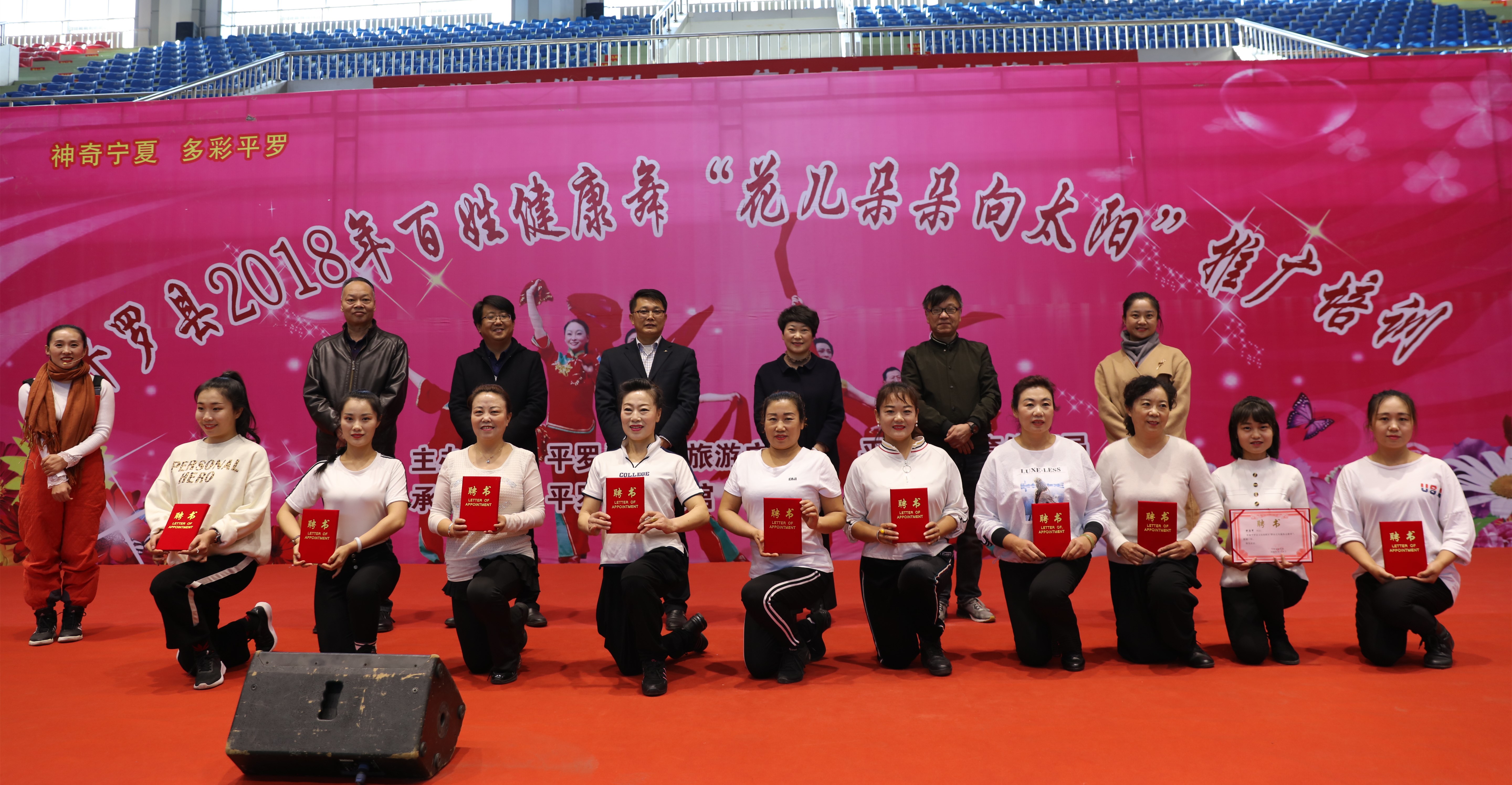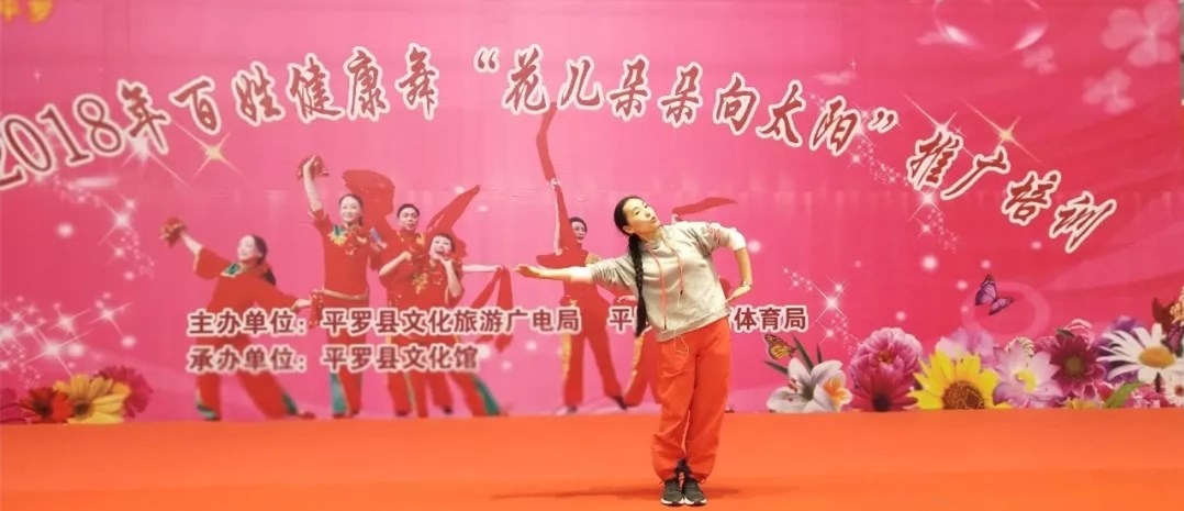 贺兰山高黄河水长,我的宁夏川春风浩荡....一首《花儿朵朵向太阳》的旋律从平罗县文体健身中心一楼的体育馆中传出,为期4天的平罗县百姓健康舞“花儿朵朵向太阳”推广培训班今天到了成果展示汇报的时刻,平罗县县委宣传部、文化旅游广电局、教育体育局有关领导观看了此次汇报演出,并给培训学员颁发了结业证书和优秀学员“群众文化服务志愿者”聘书。
