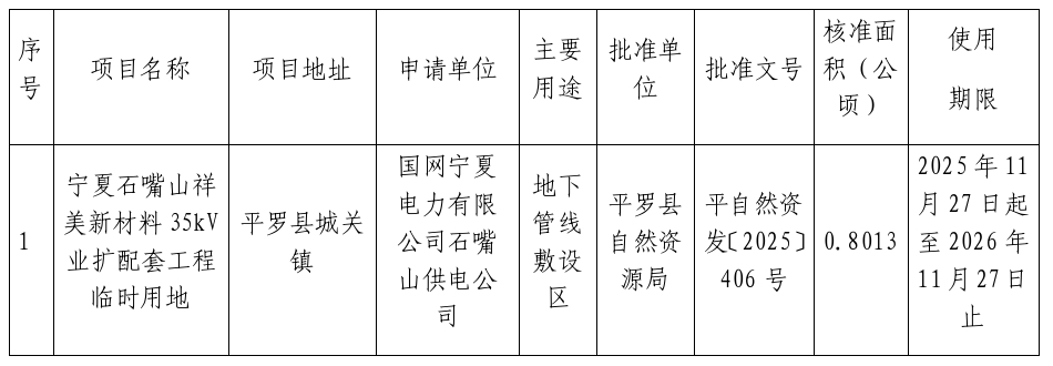 根据《自然资源部关于规范临时用地管理的通知》(自然资规〔2021〕2号)、《自然资源部办公厅关于临时用地信息填报有关工作的通知》(自然资办函〔2022〕285号)等相关文件精神,以下临时用地项目已经由平罗县自然资源局批准,现对结果进行公示,公示时间为30天。