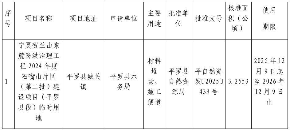 根据《自然资源部关于规范临时用地管理的通知》(自然资规〔2021〕2号)、《自然资源部办公厅关于临时用地信息填报有关工作的通知》(自然资办函〔2022〕285号)等相关文件精神,以下临时用地项目已经由平罗县自然资源局批准,现对结果进行公示,公示时间为30天。