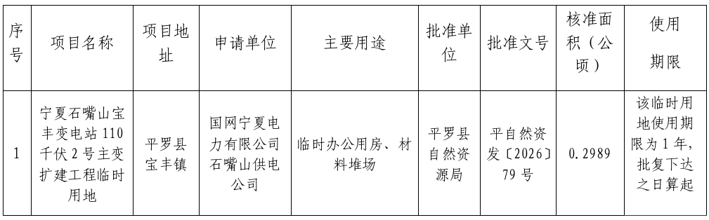 根据《自然资源部关于规范临时用地管理的通知》(自然资规〔2021〕2号)、《自然资源部办公厅关于临时用地信息填报有关工作的通知》(自然资办函〔2022〕285号)等相关文件精神,以下临时用地项目已经由平罗县自然资源局批准,现对结果进行公示,公示时间为30天。
