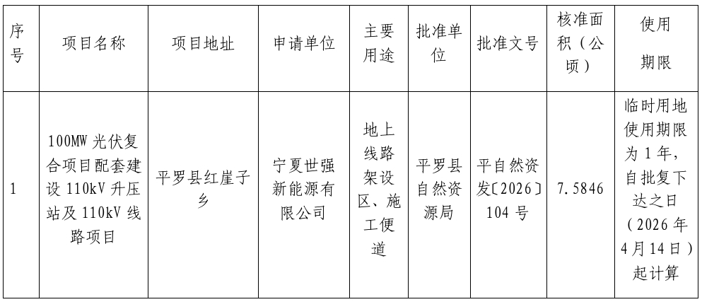 根据《自然资源部关于规范临时用地管理的通知》(自然资规〔20212号)、《自然资源部办公厅关于临时用地信息填报有关工作的通知》(自然资办函〔2022285号)等相关文件精神,以下临时用地项目已经由平罗县自然资源局批准,现对结果进行公示,公示时间为30