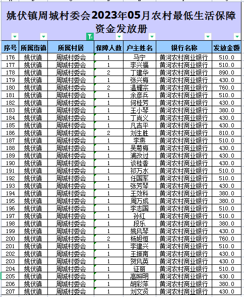 姚伏镇周城村委会2023年05月农村最低生活保障资金发放册