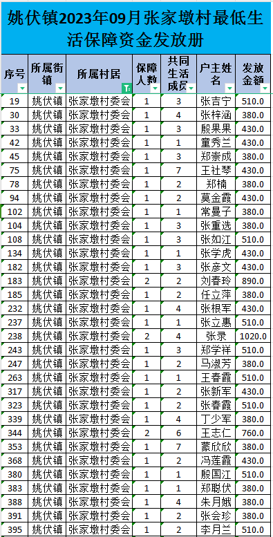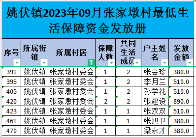 姚伏镇2023年09月张家墩村最低生活保障资金发放册