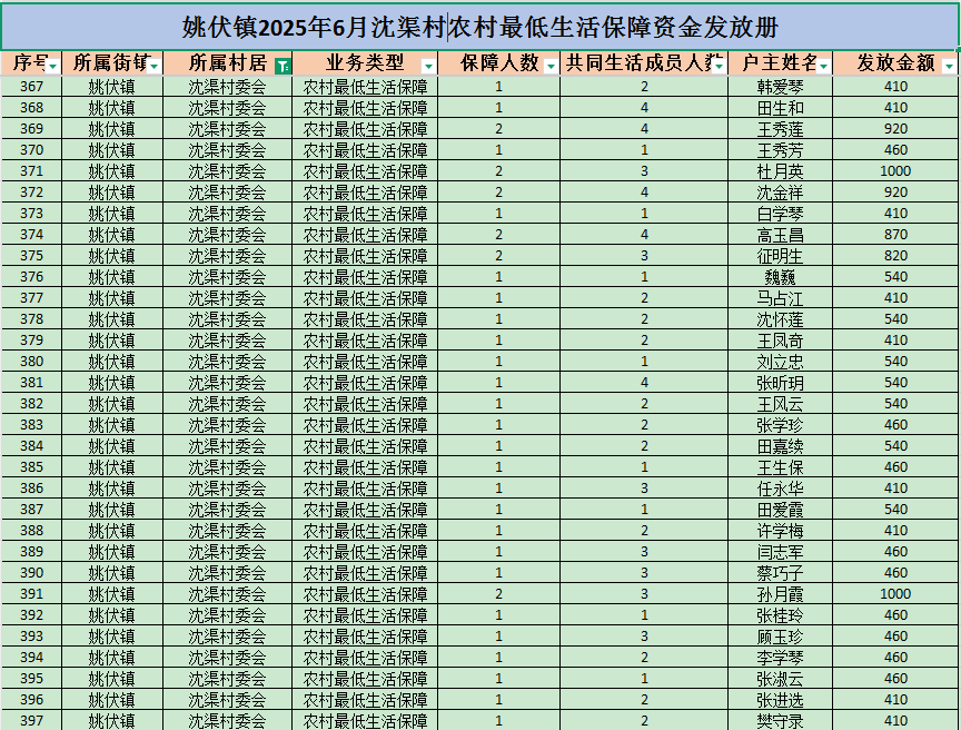 姚伏镇2025年6月沈渠村农村最低生活保障资金发放册