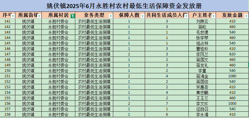姚伏镇2025年6月永胜村农村最低生活保障资金发放册