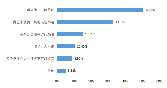 由于居民生活水平的不断提高,生活节奏的加快和消费观念的更新,外出就餐逐渐变得普遍。调查中,33%的消费者表示“自己浪不浪费,其他人管不着”,甚至有近9%的消费者表示“经济条件允许下可以浪费”。调查发现,部分餐饮企业的节俭提醒服务不到位,部分餐饮企业没有要求工作人员主动提醒顾客合理点餐或打包,部分餐饮企业打包用品需要收费等。