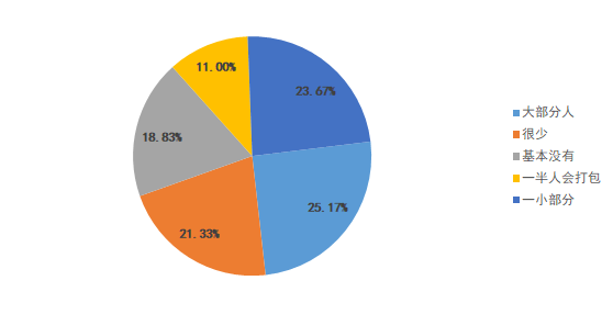 在对消费者调查中,不论是在个人点餐,还是亲友聚会,商务宴请,或者是红白喜事宴席等环境中,有三成到四成的消费者选择“从不”主动打包,选择“总是”主动打包的,只有4%—6%的占比。