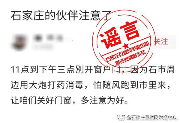 近日,网络流传着一则“11点到下午三点别开门窗,因为石市周边用大炮打药消毒,怕随风跑到市里来,让咱们关好门窗,多注意为好”的消息,经石家庄互联网举报中心向市防疫相关部门核实,该消息为谣言。