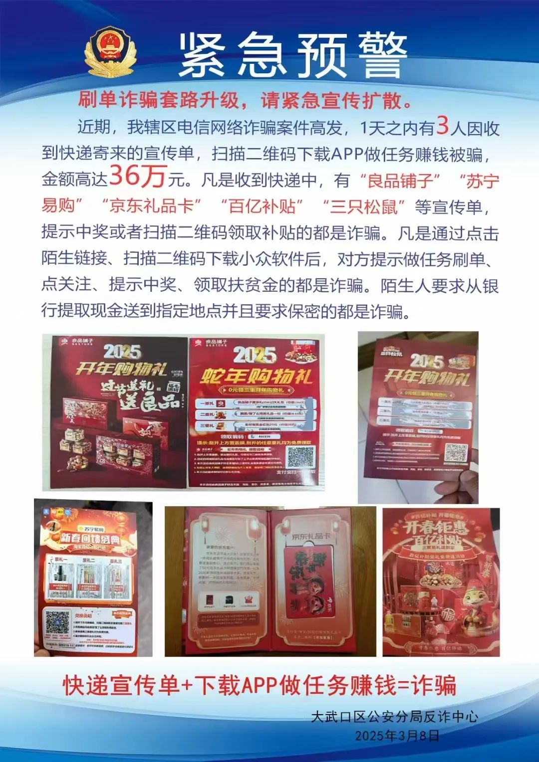 凡是收到快递中,有“良品铺子”“苏宁易购”“京东礼品卡”“百亿补贴”“三只松鼠”等宣传单,提示中奖或者扫描二维码领取补贴的都是诈骗。凡是通过点击陌生链接、扫描二维码下载小众软件后,对方提示做任务刷单、点关注、提示中奖、领取扶贫金的都是诈骗。陌生人要求从银行提取现金送到指定地点并且要求保密的都是诈骗。