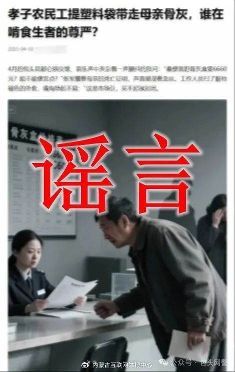 近日,一则“孝子农民工提塑料袋带走母亲骨灰,谁在啃食生者的尊严”的不实信息在网络平台传播,引发网民关注讨论。