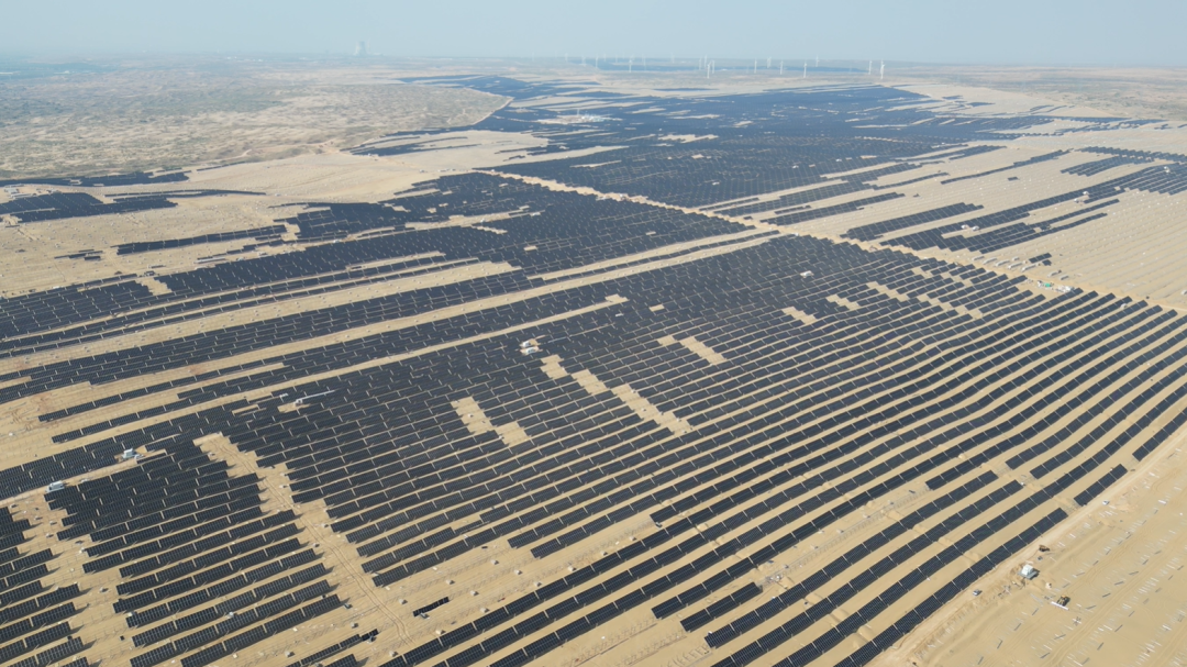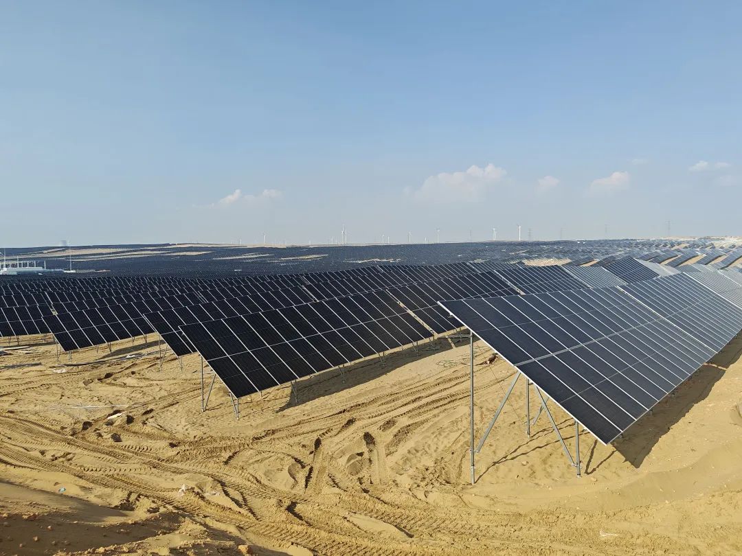 近日,烈日下红崖子乡的沙丘如金浪起伏,连绵的光伏板如深蓝色铠甲铺展。电流在板下悄然涌动,风过时,板阵泛着金属微光,与黄沙共舞。