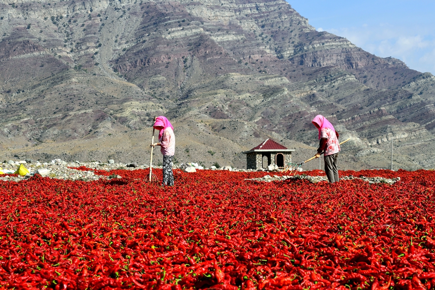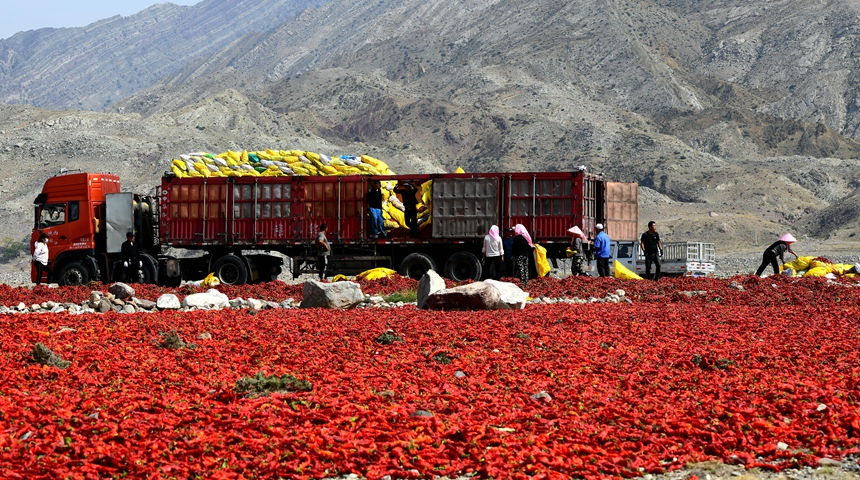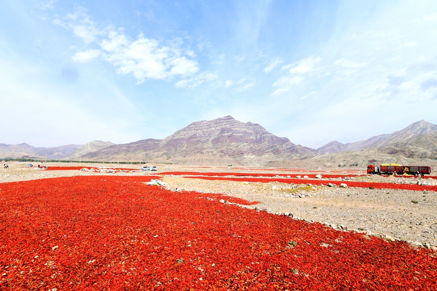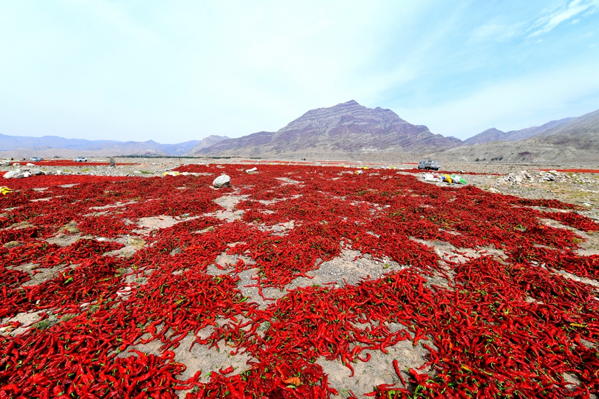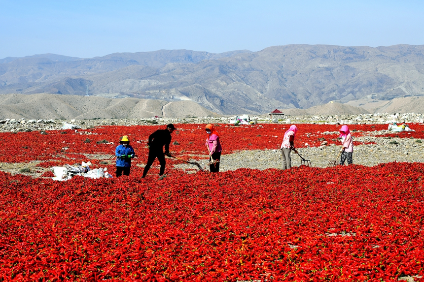 时下正是辣椒丰收的季节,在宁夏石嘴山市平罗县,火红的辣椒被采摘后,送往贺兰山下的“天然戈壁晒场”。之所以在贺兰山下的戈壁滩上晾晒辣椒,是因为这里拥有干净的山石和良好的自然环境。眼下,农户们整理着地上成片的辣椒,脸上露出丰收的喜悦。
