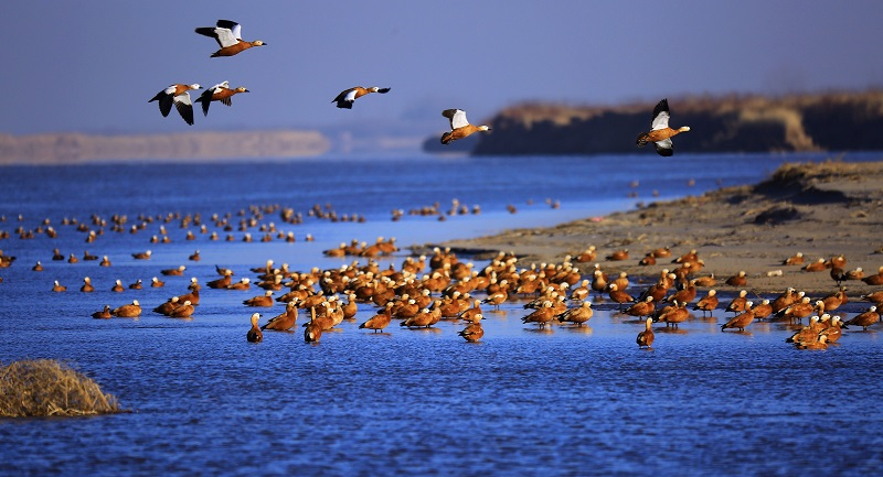 黄河岸边大片的赤麻鸭。石嘴山市新闻传媒中心通讯员 陈小组 摄