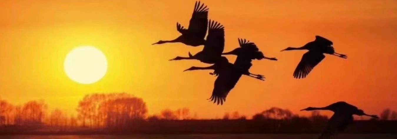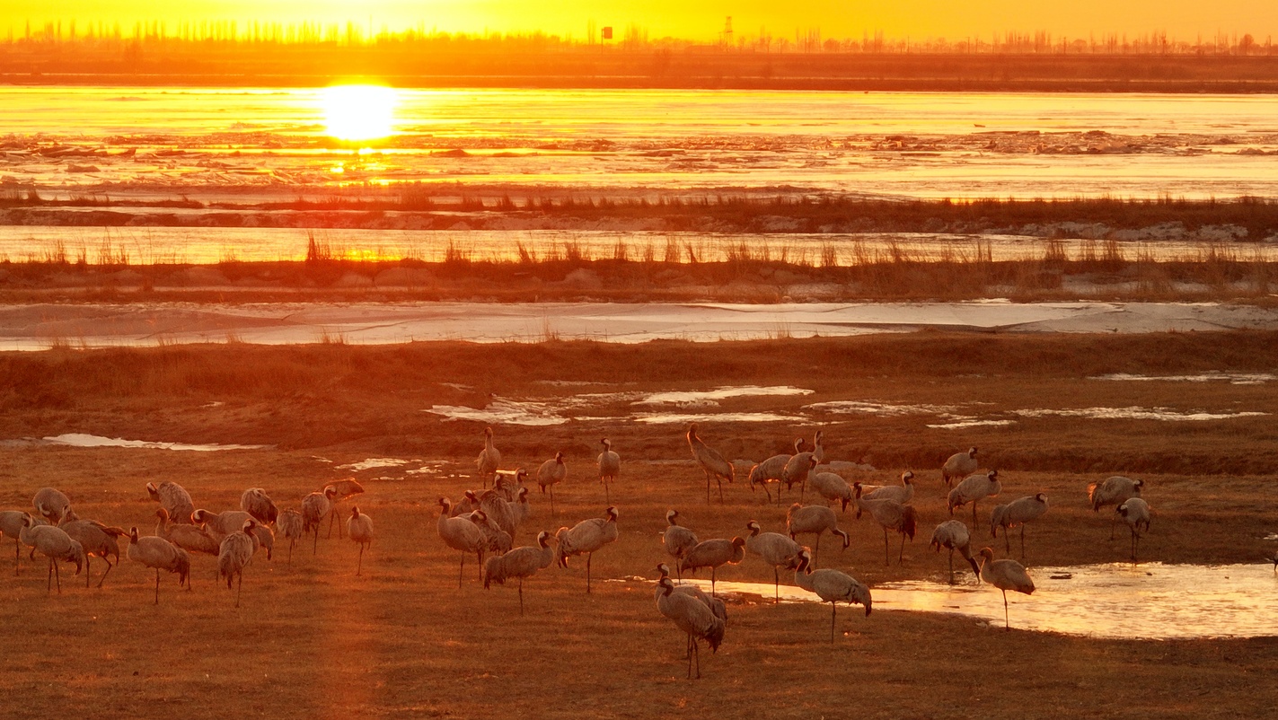 宁夏平罗县:落日余晖下 灰鹤翩翩起“舞”