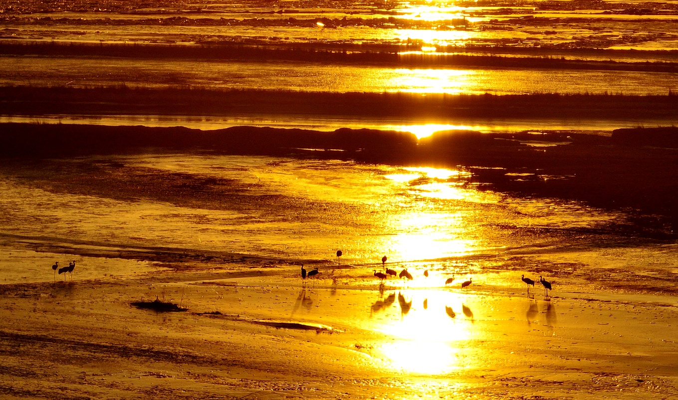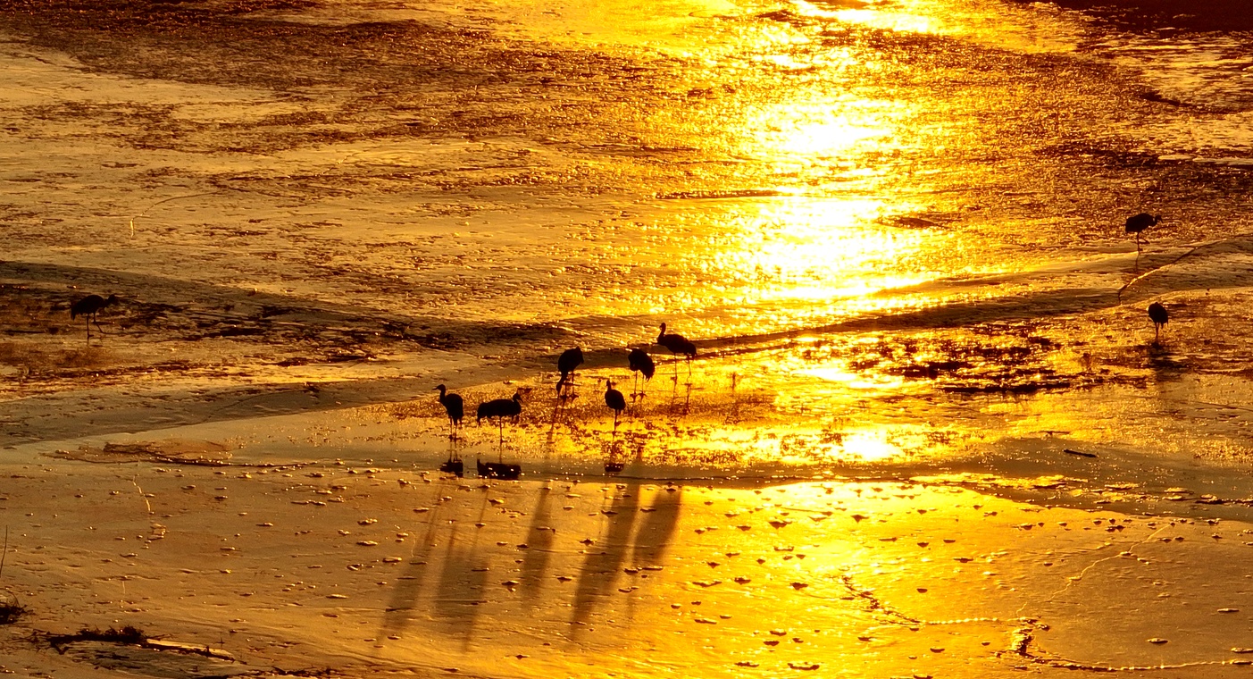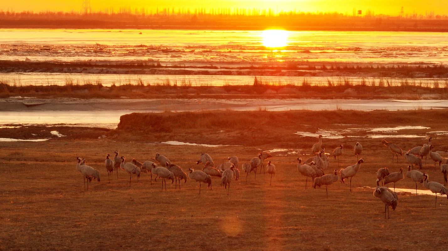 夕阳的余晖把冰面打成金黄色,落日、冰河、灰鹤,绘就了一副温馨而悠然的画面。
