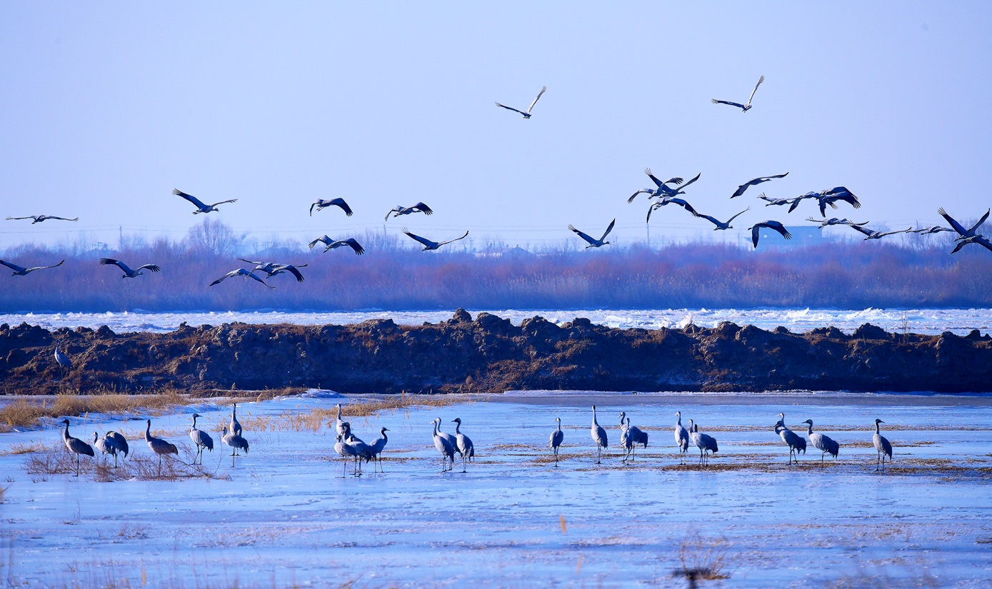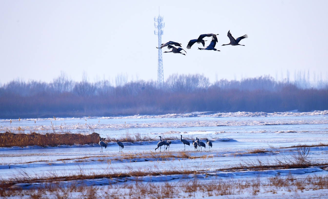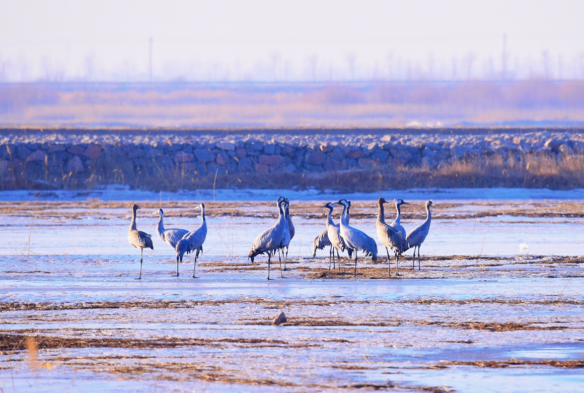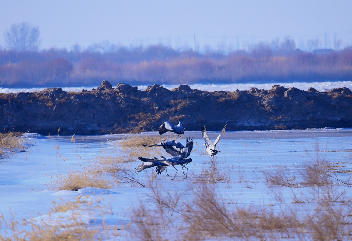 2月14日,黄河的冰还没有融化,成群灰鹤在宁夏平罗县红崖子河谷的冰面上,翩翩起“舞”,觅食栖息。