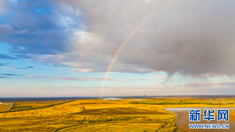 10月7日,一场阵雨过后,宁夏平罗县境内的天河湾国家湿地公园金岸稻香,红蒿遍滩,日落时波光粼粼的湖面与云中彩虹交相辉映,候鸟在此恣意飞翔。