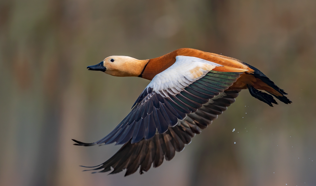 与普通的家鸭相比,赤麻鸭的体型稍大,全身为赤黑褐色,翅膀上有着明显的白色翅斑,还有铜绿色的翼镜,在飞行时,黑色的飞羽和白色的覆羽形成强烈对比,异常美丽。