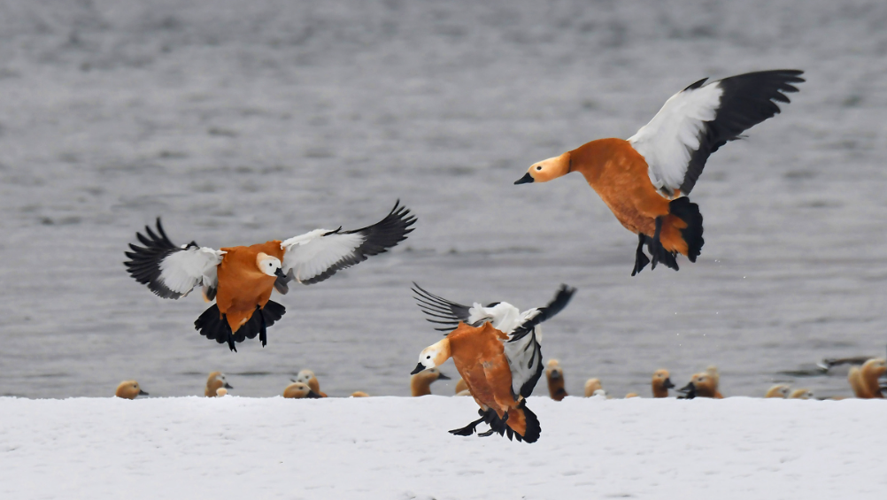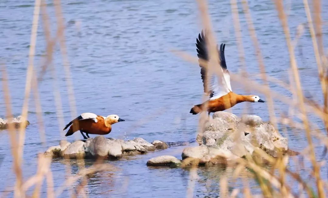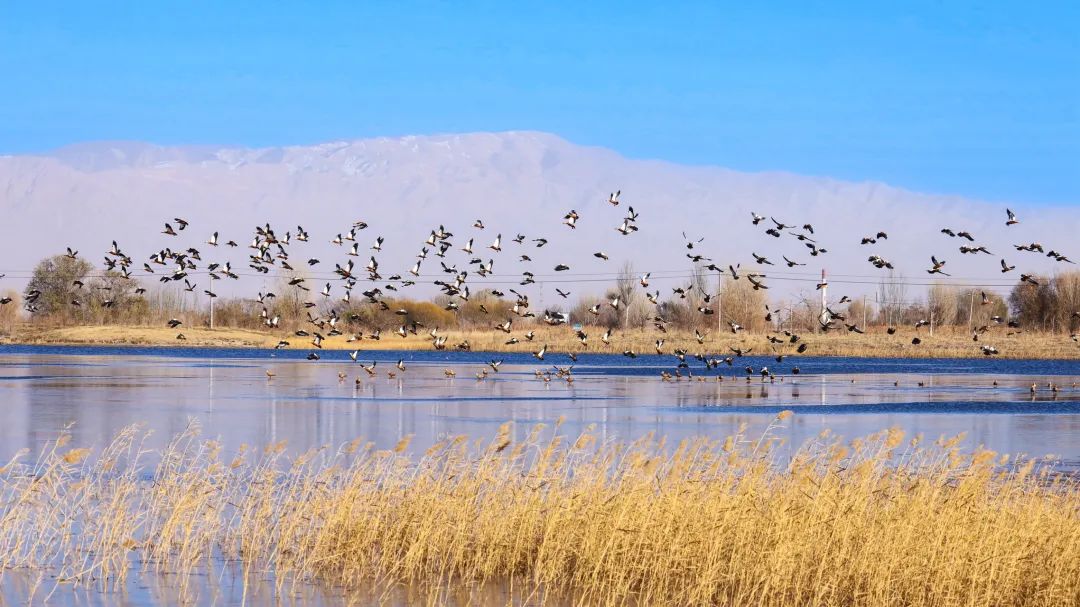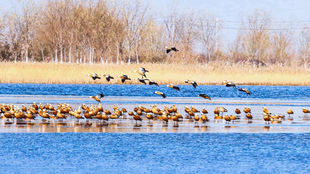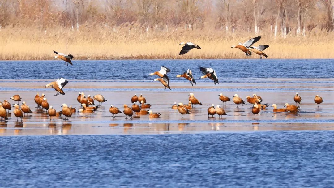 入春以来,一群群、一对对“爱情鸟”在湖东湿地相互追逐、一起觅食,赤麻鸭鲜亮的鸟羽与瑞雪覆盖的湖面、迎风摇曳的环湖芦苇相互交织,良好的生态环境吸引它们将沙湖当做迁徙的“家”。