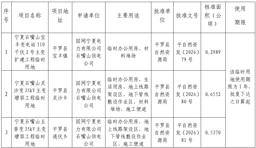 根据《自然资源部关于规范临时用地管理的通知》(自然资规〔2021〕2号)、《自然资源部办公厅关于临时用地信息填报有关工作的通知》(自然资办函〔2022〕285号)等相关文件精神,以下临时用地项目已经由平罗县自然资源局批准,现对结果进行公示,公示时间为30天。