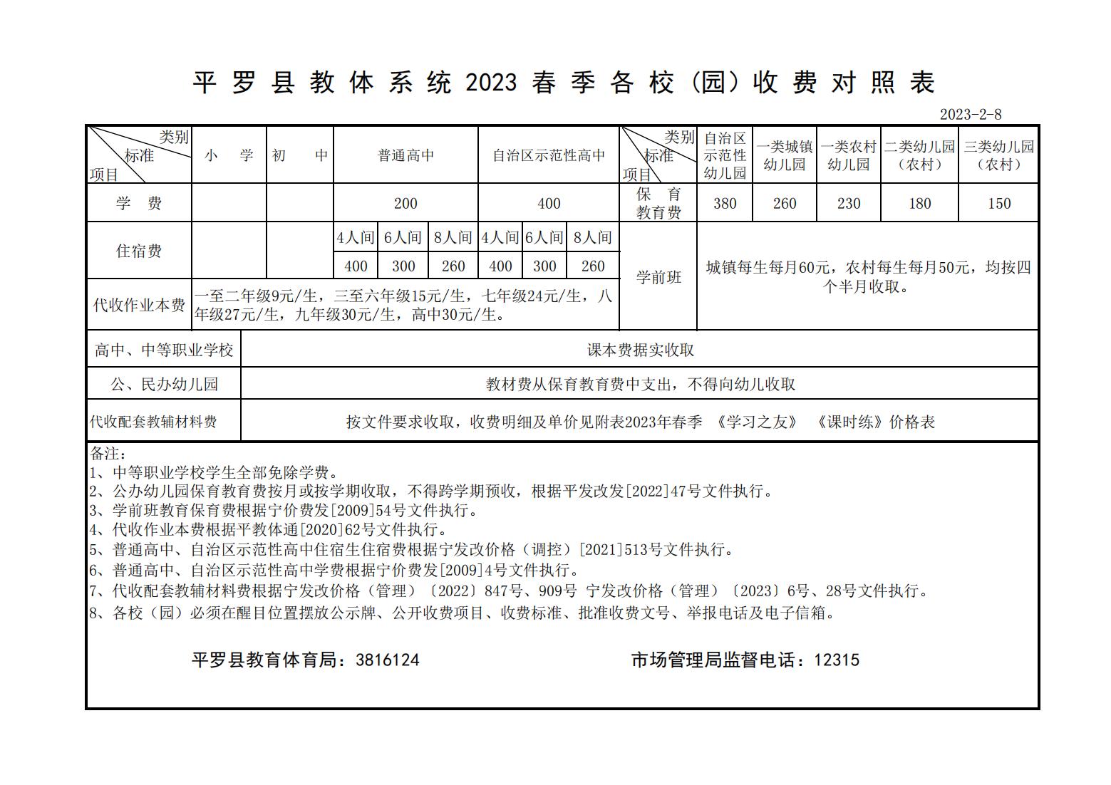 【学校管理-收费表】平罗县教育体育局关于平罗县教体系统2023年春季各校(园)收费对照表