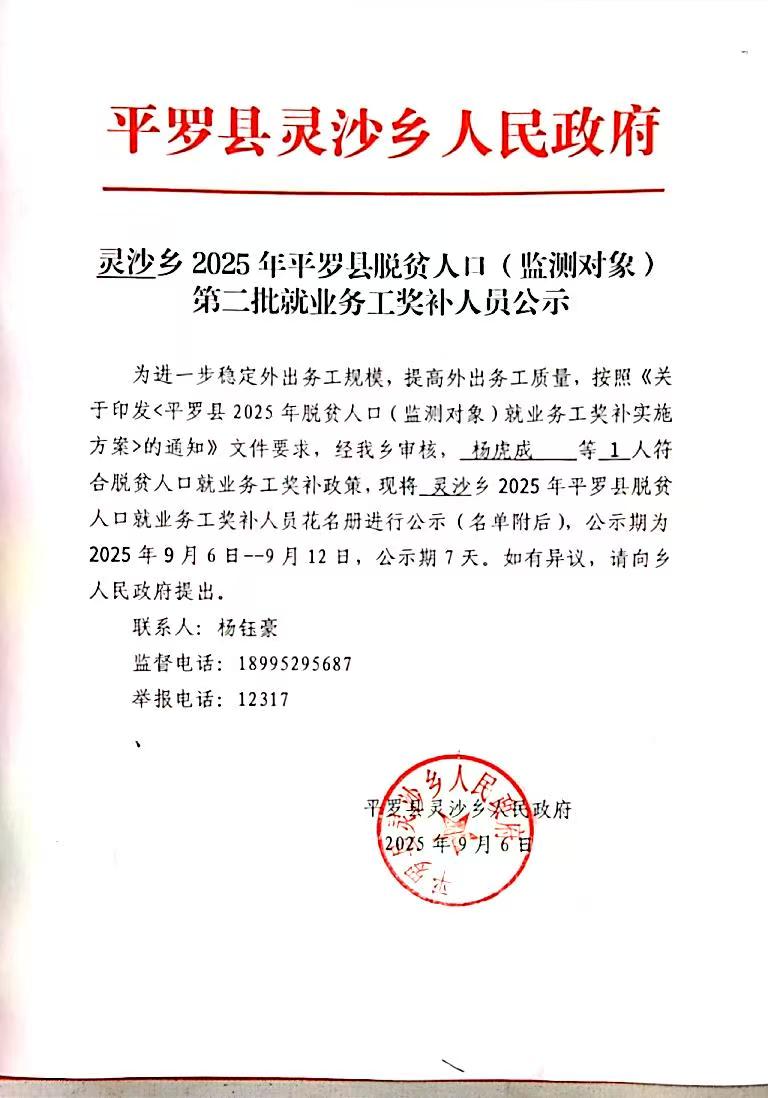 灵沙乡2025年平罗县脱贫人口(监测对象) 第二批就业务工奖补人员公示