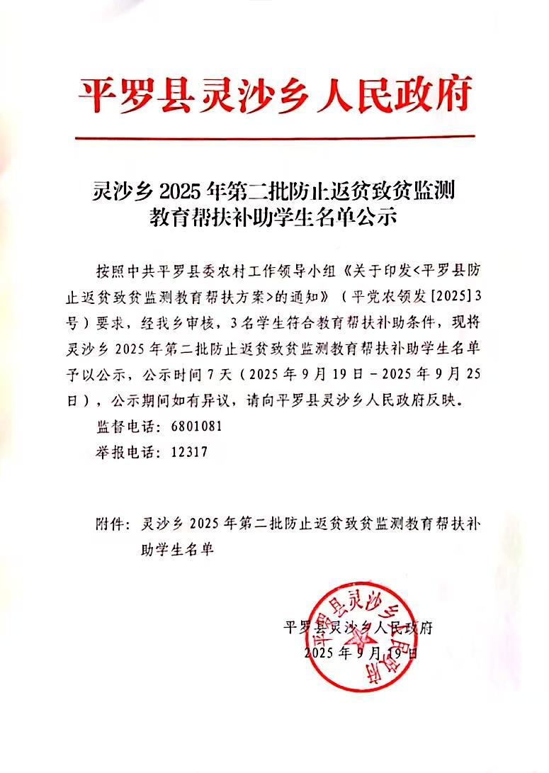 灵沙乡2025年第二批防止返贫致贫监测 教育帮扶补助学生名单公示