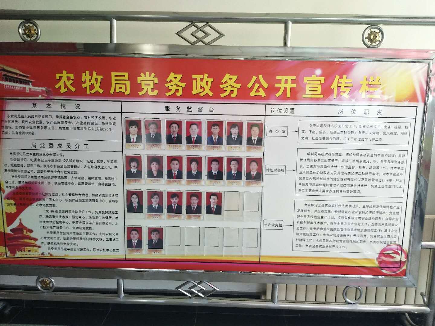 及时调整了农牧局政府信息公开工作领导小组,明确了局党组书记、局长马立军为农牧局政府信息公开工作领导小组组长,党组成员、副局长黄霄为农牧局政府信息公开工作领导小组副组长,机关各科室主要负责人为成员,各科室负责人负责公开本领域政