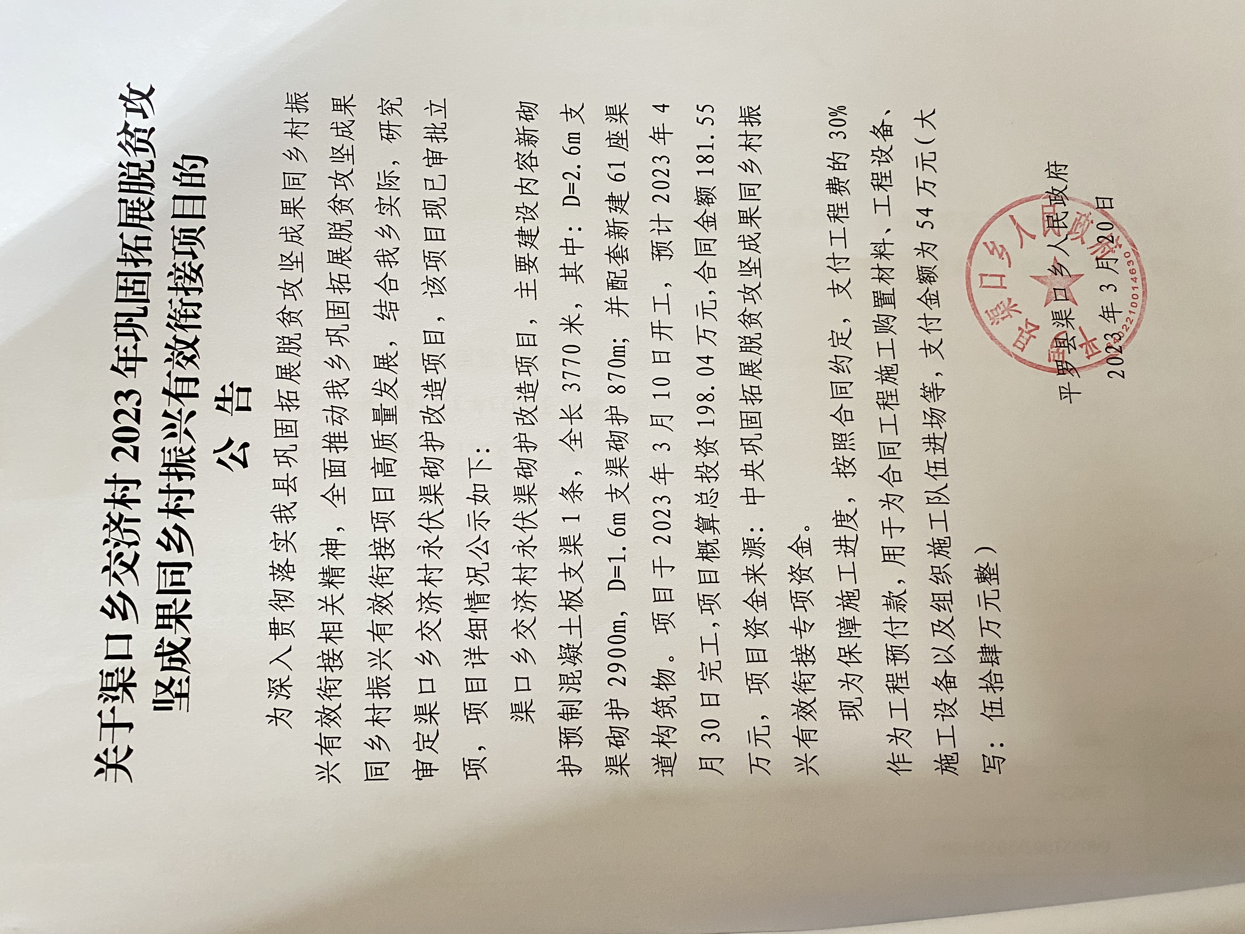 关于渠口乡交济村2023年巩固拓展脱贫攻坚成果同乡村振兴有效衔接项目的公告