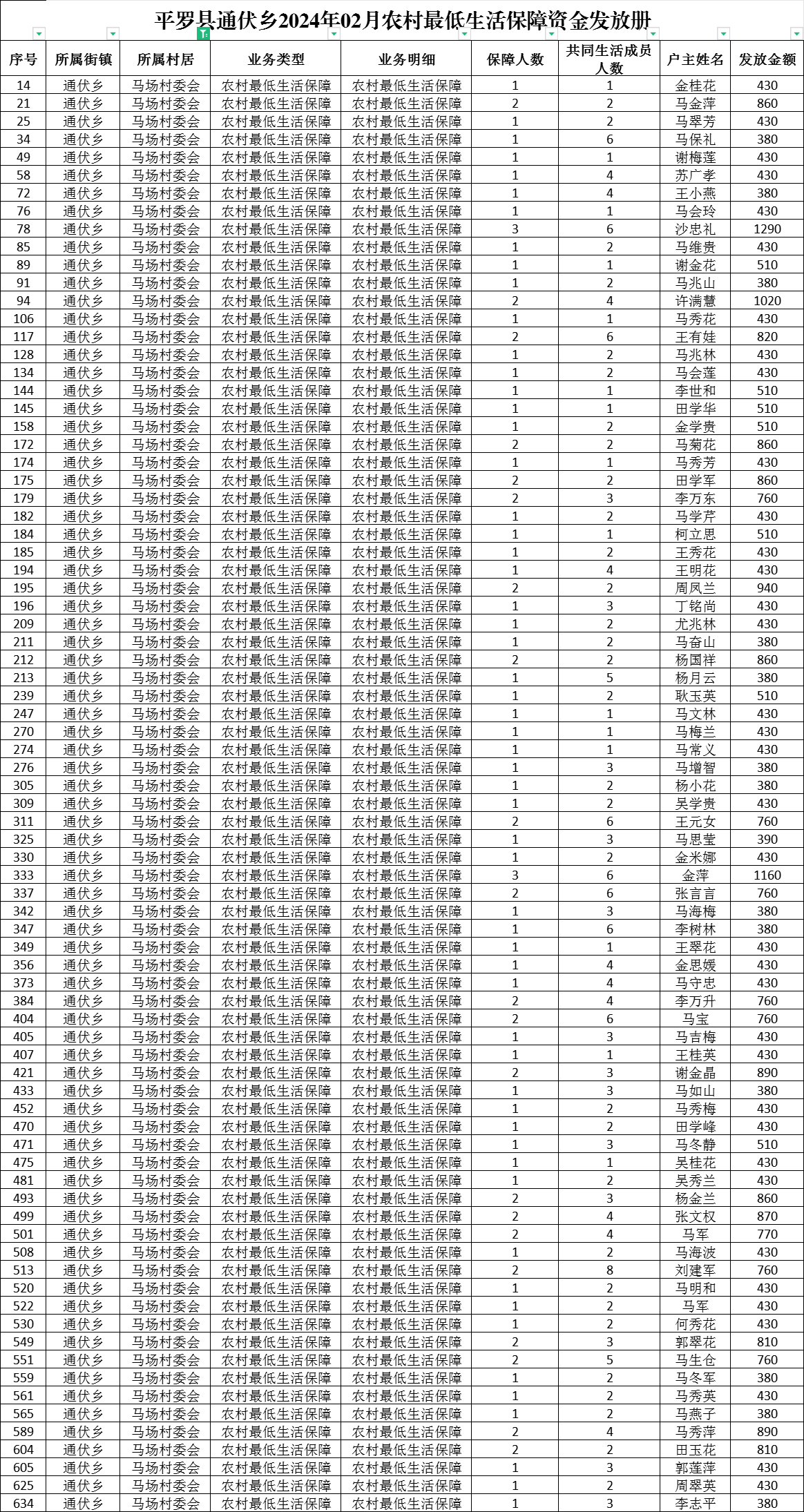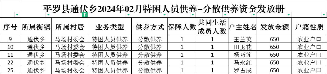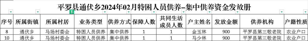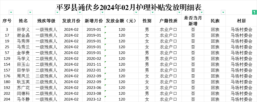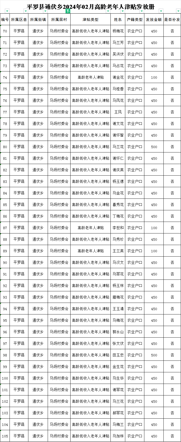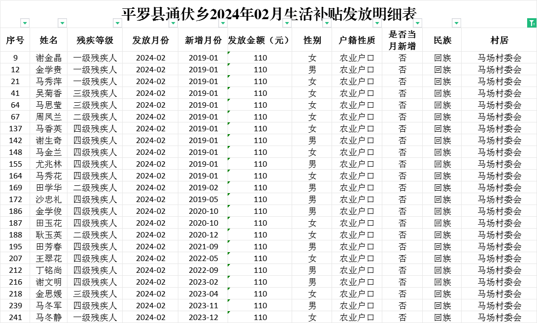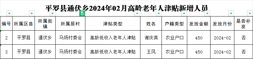 平罗县通伏乡马场村2024年02月份社会救助及高龄津贴发放名册