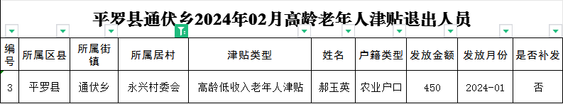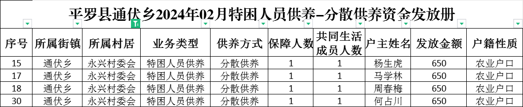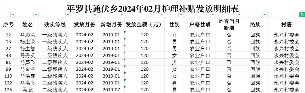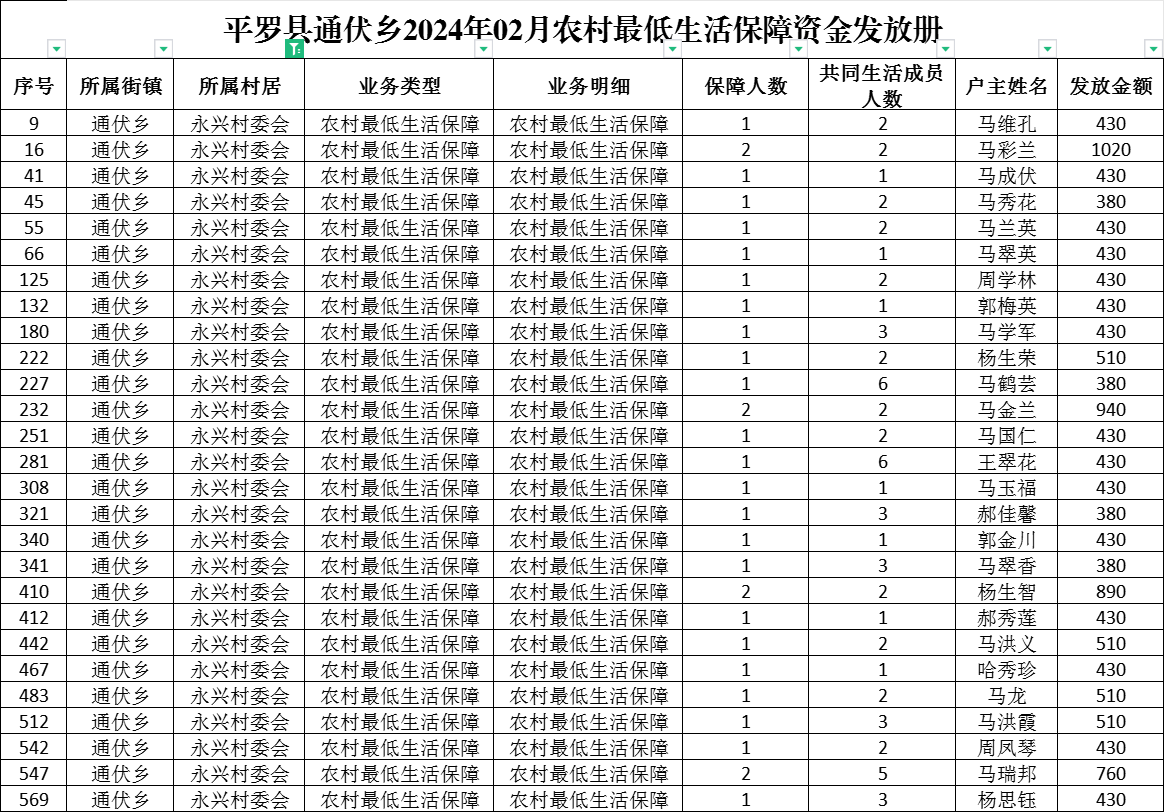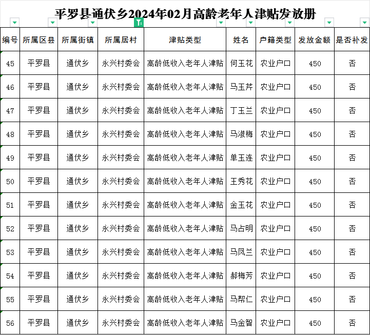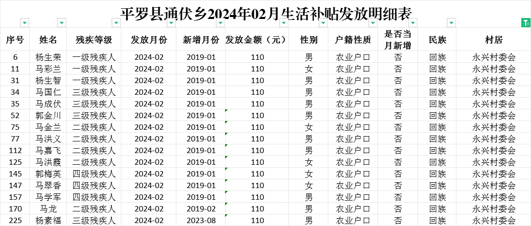 平罗县通伏乡永兴村2024年02月份社会救助及高龄津贴发放名册