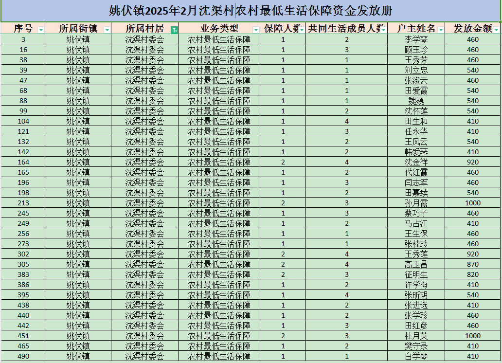 姚伏镇2025年2月沈渠村农村最低生活保障资金发放册