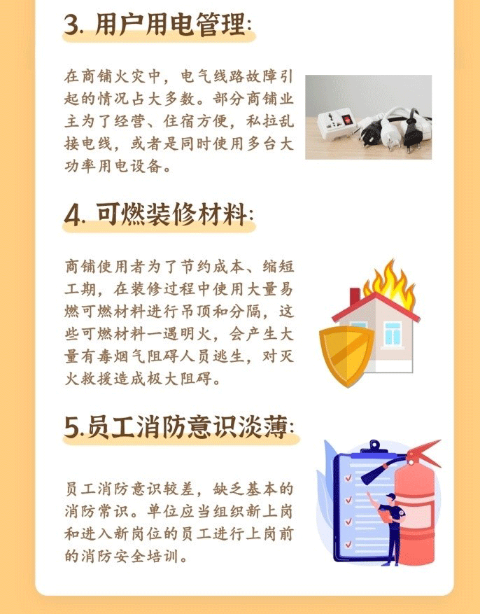 商铺内一般存放着大量易燃物品,如不注意保持适当间距,远离火源、电源,极易发生火灾。