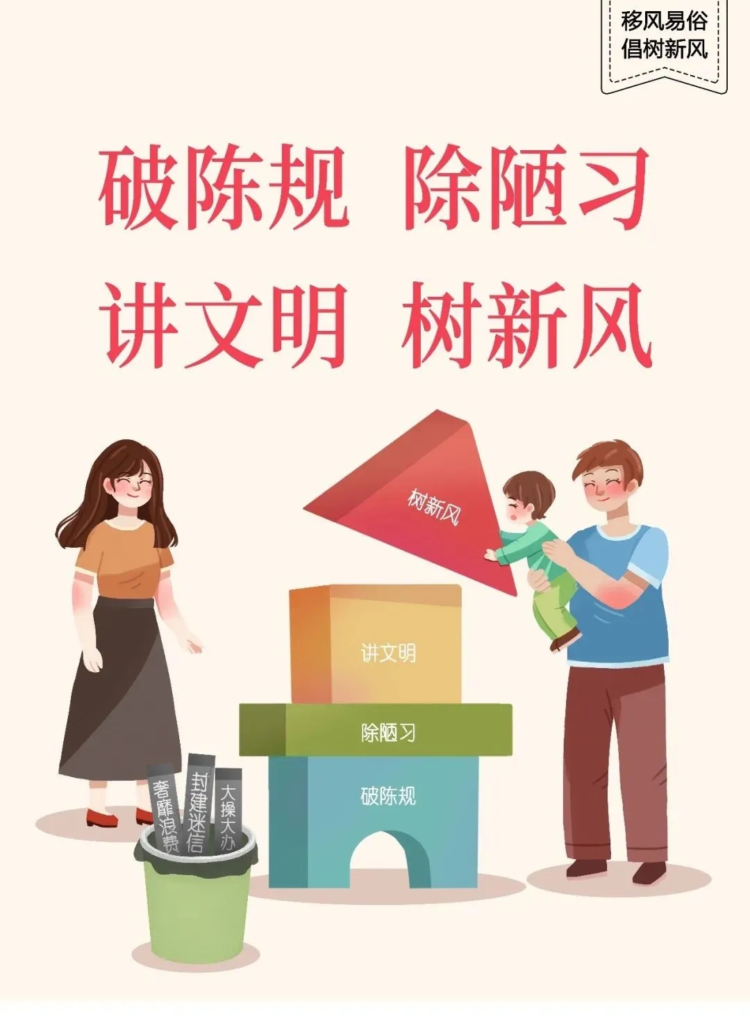 (二十三)持续推进农村移风易俗。坚持疏堵结合、标本兼治,创新移风易俗抓手载体,发挥村民自治作用,强化村规民约激励约束功能,持续推进高额彩礼、大操大办、散埋乱葬等突出问题综合治理。鼓励各地利用乡村综合性服务场所,为农民婚丧嫁娶等提供普惠性社会服务,降低农村人情负担。完善婚事新办、丧事简办、孝老爱亲等约束性规范和倡导性标准。推动党员干部带头承诺践诺,发挥示范带动作用。强化正向引导激励,加强家庭家教家风建设,推广清单制、积分制等有效办法。