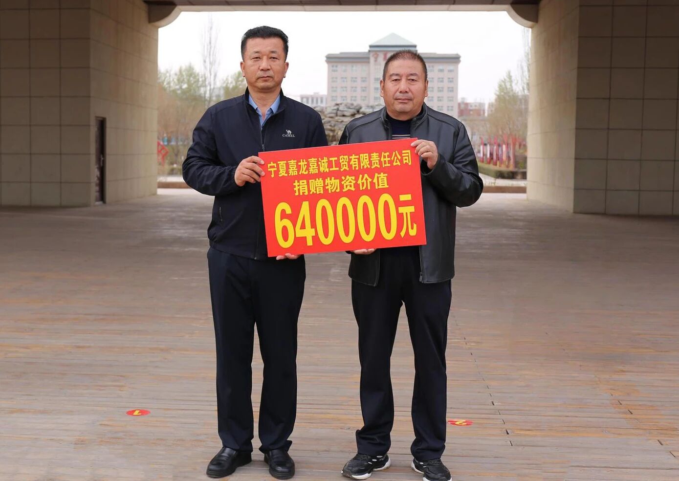 马学林(右)为平罗县困难群众捐赠的价值64万余元的生活物资。