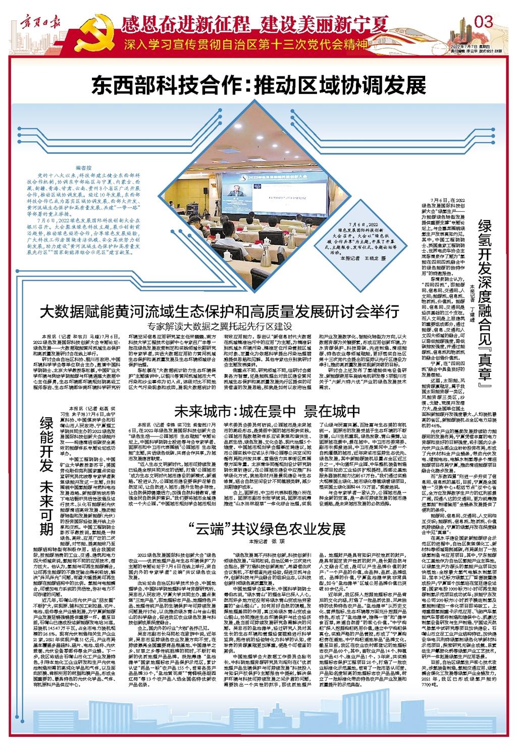 7月6日,2022绿色发展国际科技创新大会在银川召开。大会聚焦绿色科技主题,展示创新前沿趋势,推动绿色经济合作,分享绿色发展经验,广大科技工作者围绕清洁低碳、安全高效努力创新发展,助力建设“黄河流域生态保护和高质量发展先行区”“国家新能源综合示范区”建言献策。