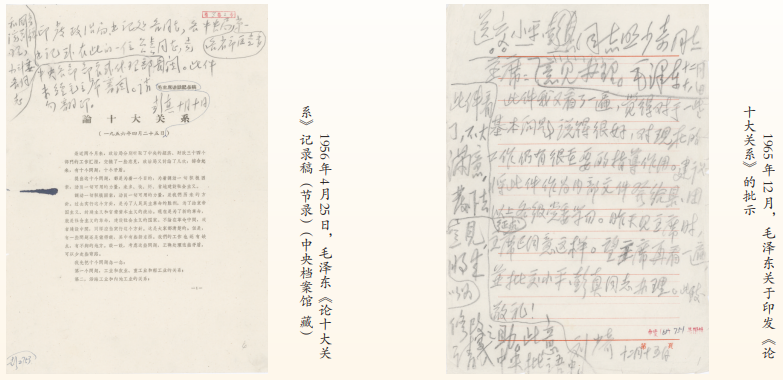 1956年4月25日,毛泽东在中央政治局扩大会议上作了《论十大关系》的讲话,5月2日又在最高国务会议上讲了一次。从那时到现在已经过去70年了。1976年12月26日,经过毛泽东亲自审定的《论十大关系》整理稿在《人民日报》全文发表,距今也已经50年了。中央档案馆馆藏的《论十大关系》(一九五六年四月二十五日毛主席讲话记录稿)、毛泽东关于印发《论十大关系》的批示等珍贵档案,真实反映了《论十大关系》出台前后的历史瞬间。