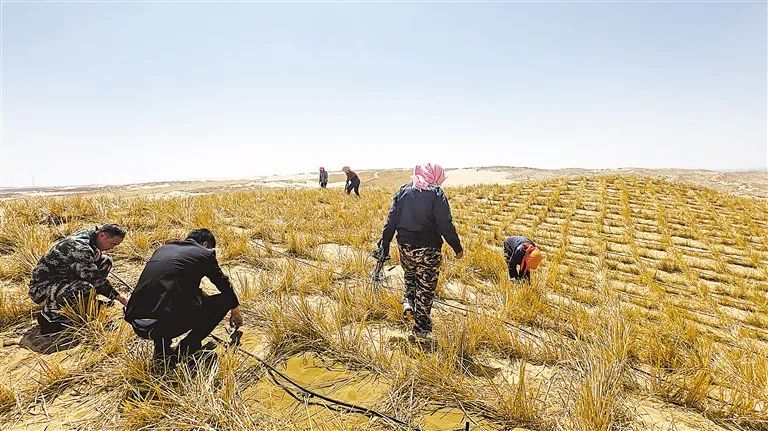 4月下旬,在平罗县河东毛乌素防沙治沙系统治理项目工程一标段,由30人组成的扎草方格队伍先沿着直线纵向扎草入沙,再横向扎草,继而形成长宽各1米的草方格,一座座沙山如同穿上一件草方格“毛衣”。“我们采用‘草方格+沙结皮’方式治理流动沙地,20天已完成500亩沙地的扎草任务。”来自灵武市白芨滩的工人马少岐介绍,如果保持每天扎草30余亩的速度,两个月便可完成3000亩沙地的扎草任务,雨季来临前栽上苗,治沙就算成功了。