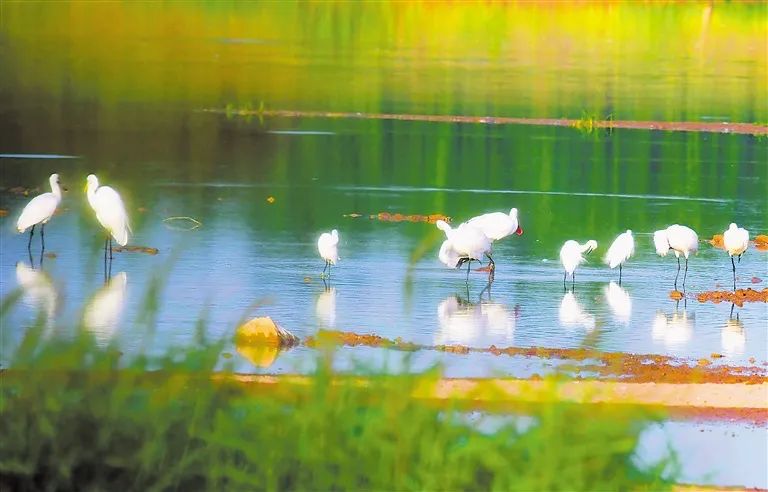 天河湾国家湿地公园面积5.85万亩,现有维管束植物57科124属183种,脊椎动物24目50科159种;湿地内有野生鱼类3目5科25种,野生鸟类14目33科67属112种,被誉为黄河流域湿地的一颗“明珠”。“每天有20余名护林员对管护区南北中三大片区和交接处上的7个点位进行全方位、无死角巡查,不断提高湿地保护监管水平。”该公园护林队队长吕军平介绍,公园内修建了6个观鸟亭,方便群众观赏野生鸟类和湿地公园美丽风光。