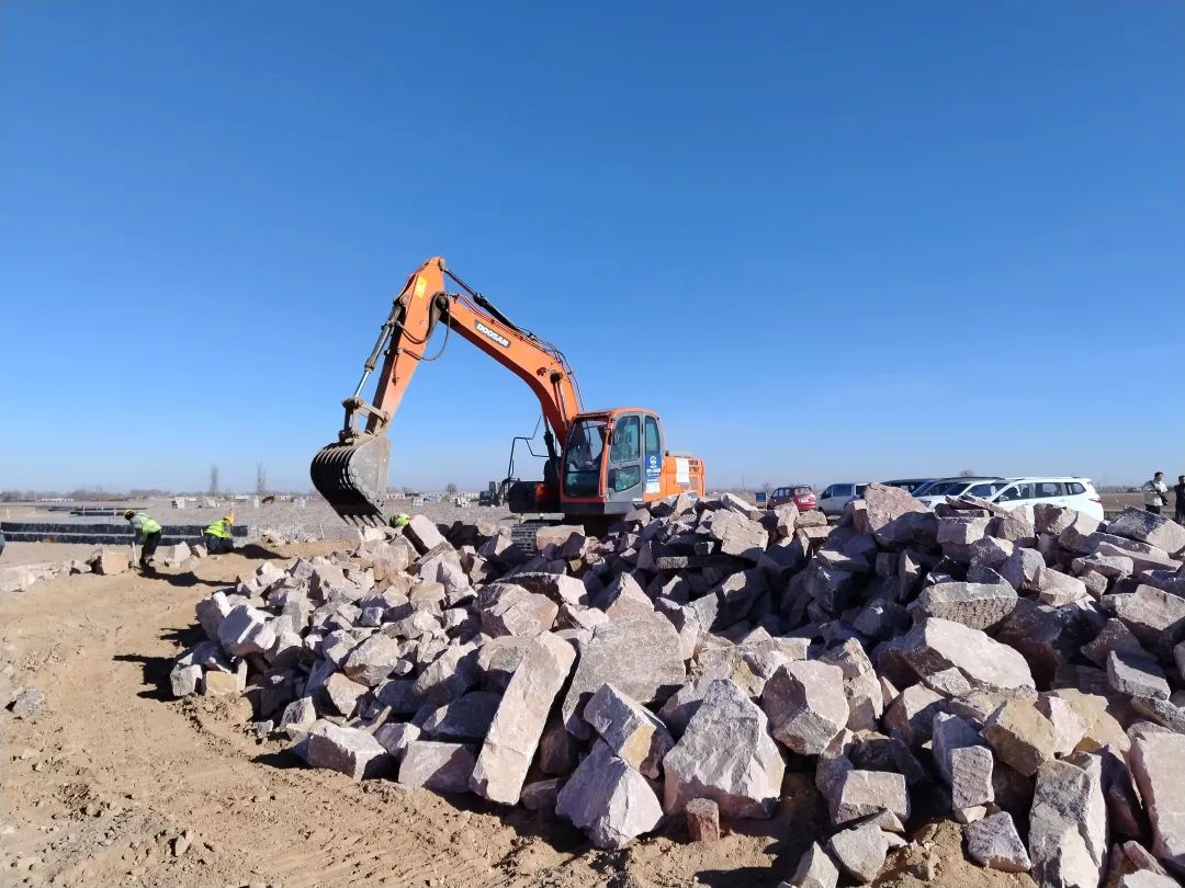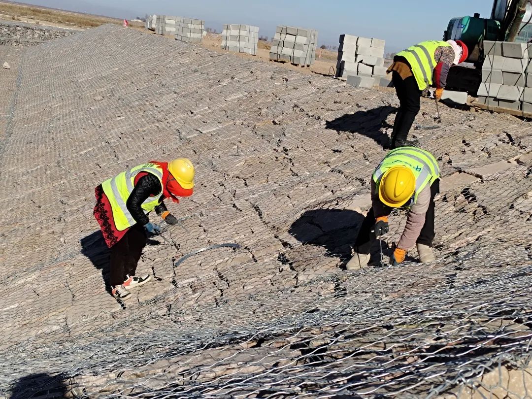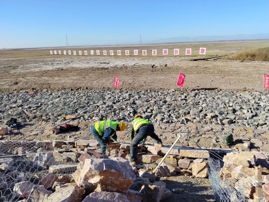 初冬时节,寒风习习,但黄河宁夏段河道治理工程(平罗段)四标段下八顷6号控导工程施工现场依然是一片火热的场景,推土机轰鸣,挖掘机穿梭往来,施工人员正在进行格宾石笼护坡工序,大家争分夺秒赶进度。