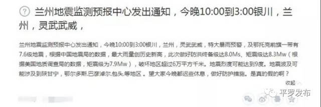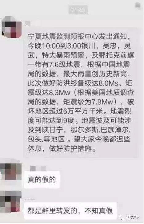 近日,一则“宁夏地震监测预报中心发出通知,今晚10:00到3:00银川,吴忠,灵武,特大暴雨预警,及鄂托克前旗一带有7.6级地震,根据中国地震局的数据,最大雨量创历史新高,此次做好防洪终备级达8.0MS、矩震级达8.3Mw(根据美国地质调查局的数据,矩震级为7.9Mw),破坏地区超过6万平方千米。地震烈度可能达到9度。地震波及可能涉及到陕甘宁,鄂尔多斯.巴彦淖尔.包头.等地区 “信息在多个朋友圈及微信群中传播....