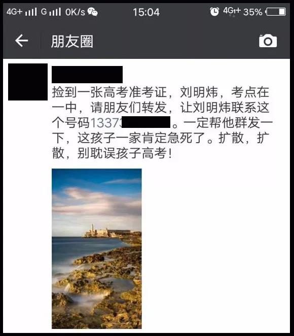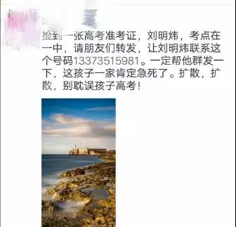 【“捡到一张高考准考证,刘明炜,考点在一中,请朋友们转发,让刘明炜联系这个号码13xxxxxxxxx。一定帮他群发一下,这孩子一家肯定急死了。扩散,扩散,别耽误孩子高考!”】