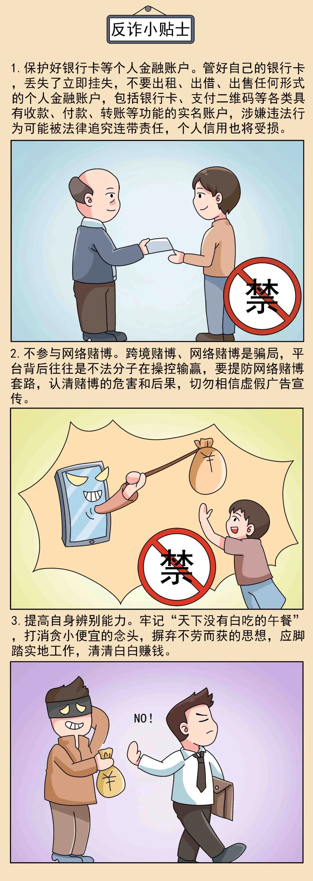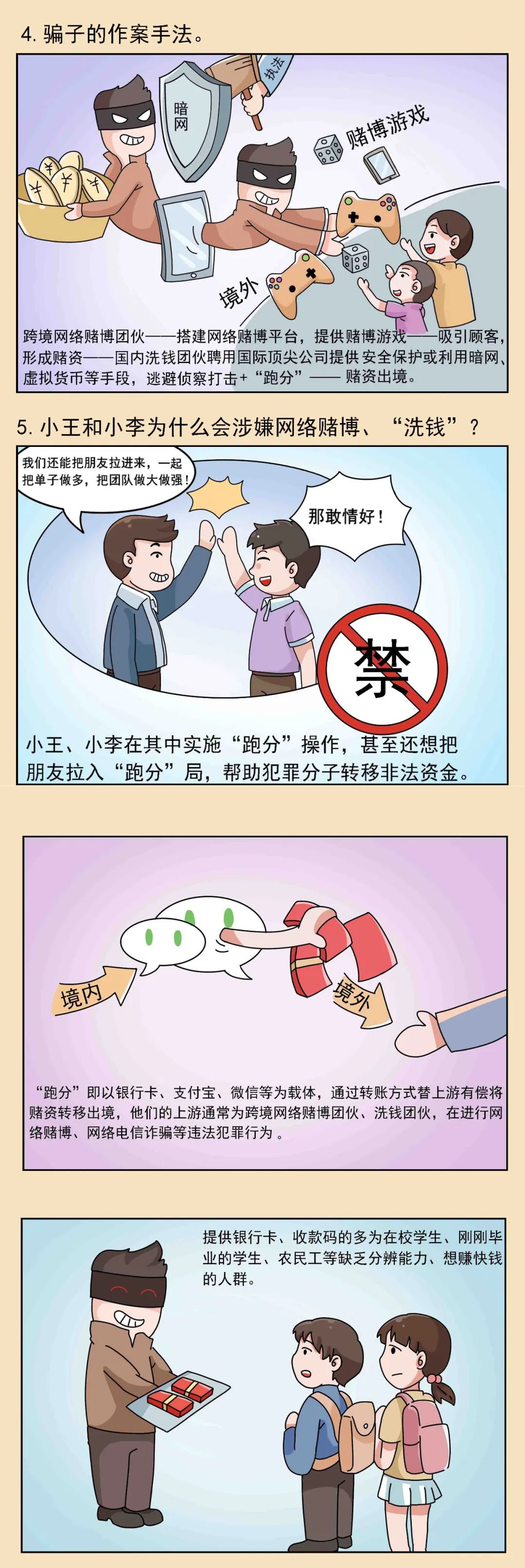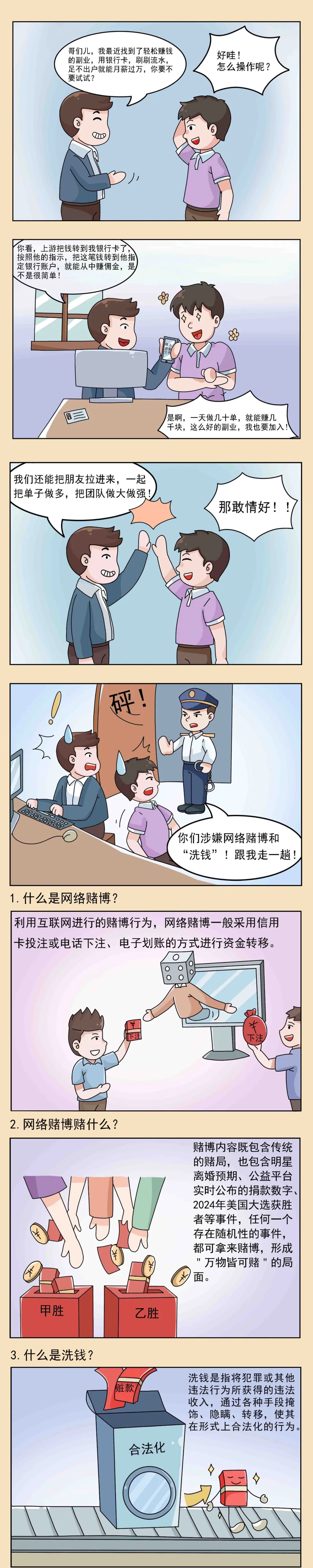 近年来网络赌博、“洗钱”案件层出不穷,犯罪分子会以“副业”为幌子,以“月薪过万”“简单上手”为噱头,吸引在校学生、刚刚毕业的学生或农民工等缺乏分辨能力、想赚快钱的人群。网络赌博和“洗钱”等违法行为严重损害人民群众合法权益、败坏社会风气、影响经济社会健康发展,本期漫画提醒各类人群警惕副业陷阱,防范网络赌博和“洗钱”