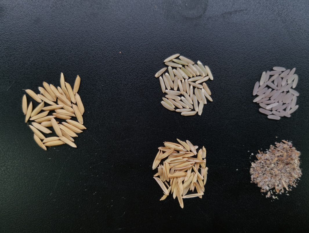 左中右依次为:稻谷;糙米和稻壳(颖壳);精米和麸皮、胚芽(作者 摄)
