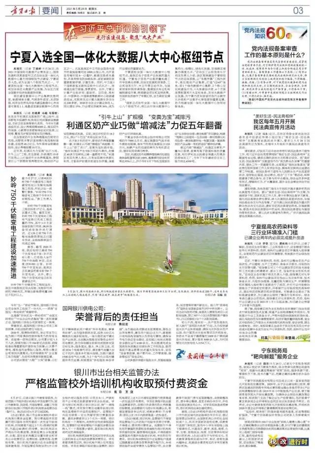 2021年5月28日,《宁夏日报》3版刊发消息,国家发展和改革委宣布正式启动全国一体化大数据中心算力网络枢纽节点建设,宁夏成功入选,成为全国八大枢纽节点之一。 我区建设数据中心产业集群优势明显,能源储备丰富,气候条件适宜,无须除湿,利用全自然风冷技术建设数据中心PUE值可降至1.1,是最适宜建设数据中心的地区之一。宁夏获批全国一体化大数据中心枢纽节点,将加快我区大数据产业发展,为全区乃至全国数字经济发展提供保障。 宁夏不仅在八大国家枢纽节点中占据一席之地,中卫市还被列为国家10个数据中心集群之一。“十三五”期间,我区电子信息制造业与软件和信息技术服务业年均增速超过20%,信息通信业累计收入314亿元,数据中心产业发展总指数位居全国第9、西部第1,我区算力质效分指数居全国第4、算力资源环境分指数居全国第3。 在今年9月举行的首届算力产业大会上,发布了全国一体化算力网络国家枢纽节点宁夏枢纽建设总体战略,提出宁夏枢纽建设“1357”总体思路。