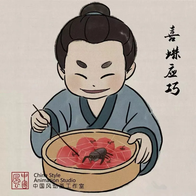 这也是较早的一种乞巧方式,其俗稍晚于穿针乞巧,大致起于南北朝之时。将蜘蛛装于盒内或用碗覆盖,并根据一定的标准来判断是否乞得巧来,如有以是否结网为标准的,若结网就得巧;有以所结网丝多寡为标准的,网结得越密表示乞到的巧越多;有以网结得是否有条理为标准的,有条理则谓得巧。”