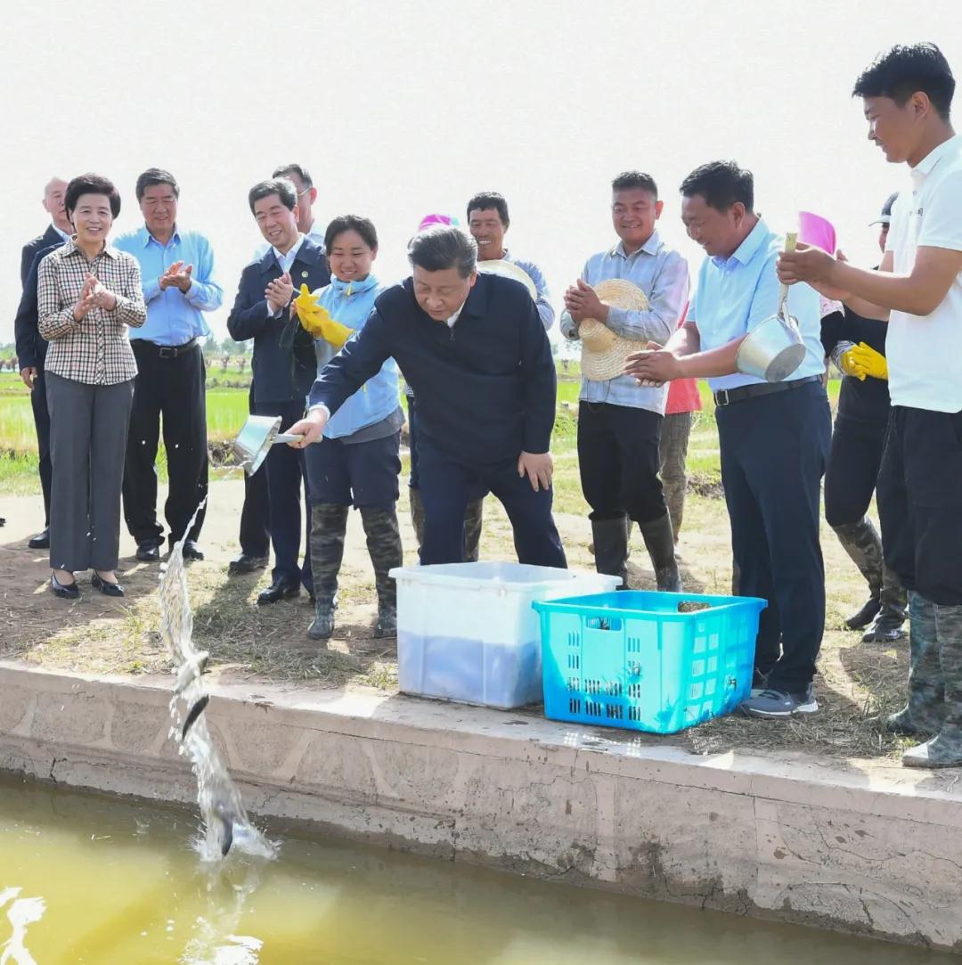 在黄河水滋养下,宁夏平原土地肥沃、物产丰富,素有“塞上江南”之称。9日下午,习近平来到银川市贺兰县稻渔空间乡村生态观光园,听取宁夏现代农业发展、农业合作社带动农民增收致富运营模式等情况汇报,观看宁夏特色农产品展示,了解稻渔种养业融合发展的创新做法。习近平登上观景塔,俯瞰园区全貌。微风轻拂,秧苗摇曳,一派生机勃勃。他沿着田埂走进稻田,同正在劳作的村民们亲切交谈。村民们告诉总书记,现在有土地流转费、劳务费,还有年底分红,收入提高了,也有保障了。正值放鱼时节,习近平舀起鱼苗、蟹苗,放进田边水渠。习近平强调,发展现代特色农业和文化旅游业,必须贯彻以人民为中心的发展思想,突出农民主体地位,把保障农民利益放在第一位。要探索建立更加有效、更加长效的利益联结机制,确保乡亲们持续获益。要注意解决好稻水矛盾,采用节水技术,积极发展节水型、高附加值的种养业,保护好黄河水资源。目前,疫情防控形势稳步向好,要继续抓好常态化疫情防控,加快恢复社会生产生活正常秩序。