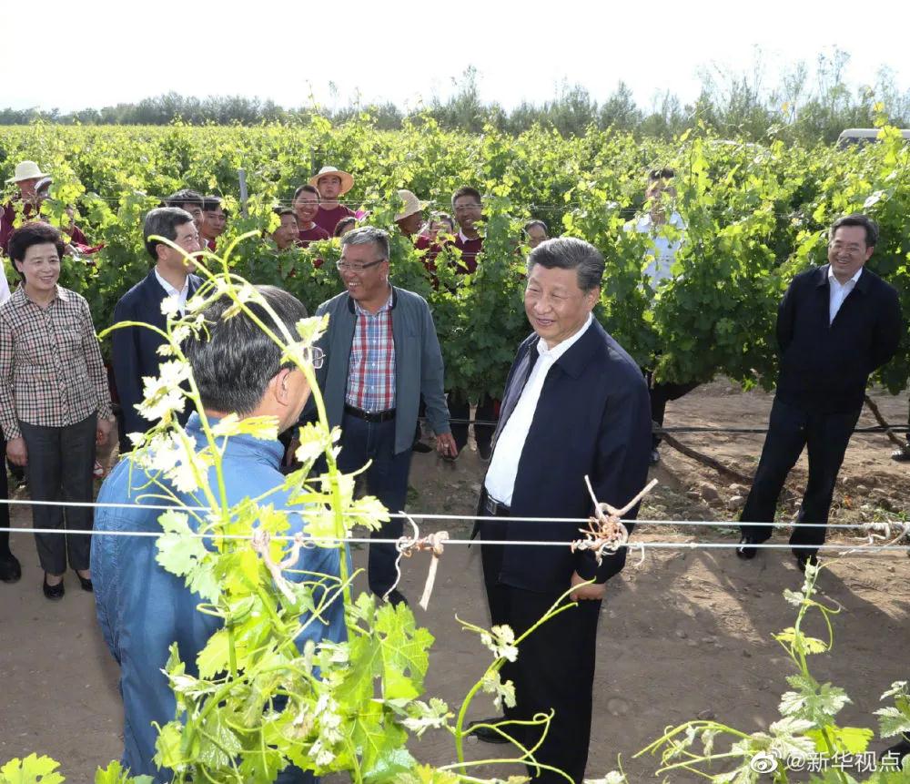 在葡萄种植园,习近平同正在作业的工人和技术人员交流,了解葡萄种植技术、产品销路和收入情况。贺兰山东麓日照充足、灌溉便利,适合种植酿酒葡萄。习近平强调,随着人民生活水平不断提高,葡萄酒产业大有前景。宁夏要把发展葡萄酒产业同加强黄河滩区治理、加强生态恢复结合起来,提高技术水平,增加文化内涵,加强宣传推介,打造自己的知名品牌,提高附加值和综合效益。